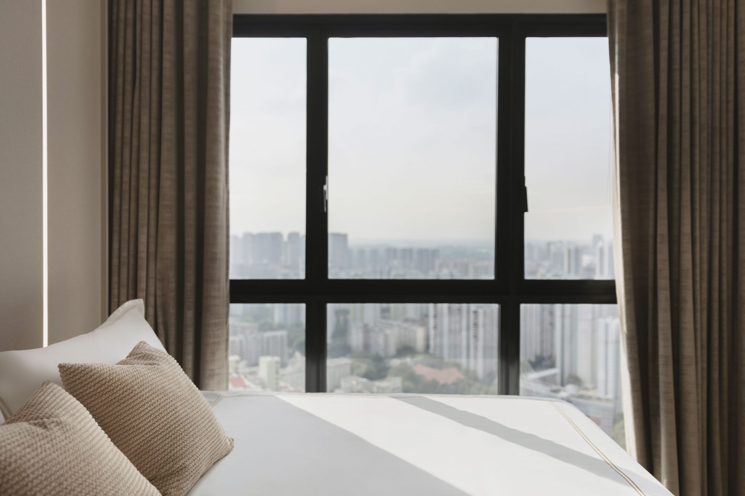 The homeowner was keen on having a monochromatic palette with a modern minimalist interior style. A full height bronze mirror was built at the entryway to visually expand the space. The interior designer suggested the integration of a custom dining table and a settee bench to maximise space. The use of acrylic leg stands ties together with the sleek design theme of the home as well. As the homeowner often travels and occasionally works from home, a dedicated home office was designed such that it allows ample storage space and an abundance of natural light from the window to pour in, which further enhances a conducive environment. Electrical sockets were integrated within the custom headboard of the master bedroom as space-saving solutions which cultivates a neat and tidy environment.