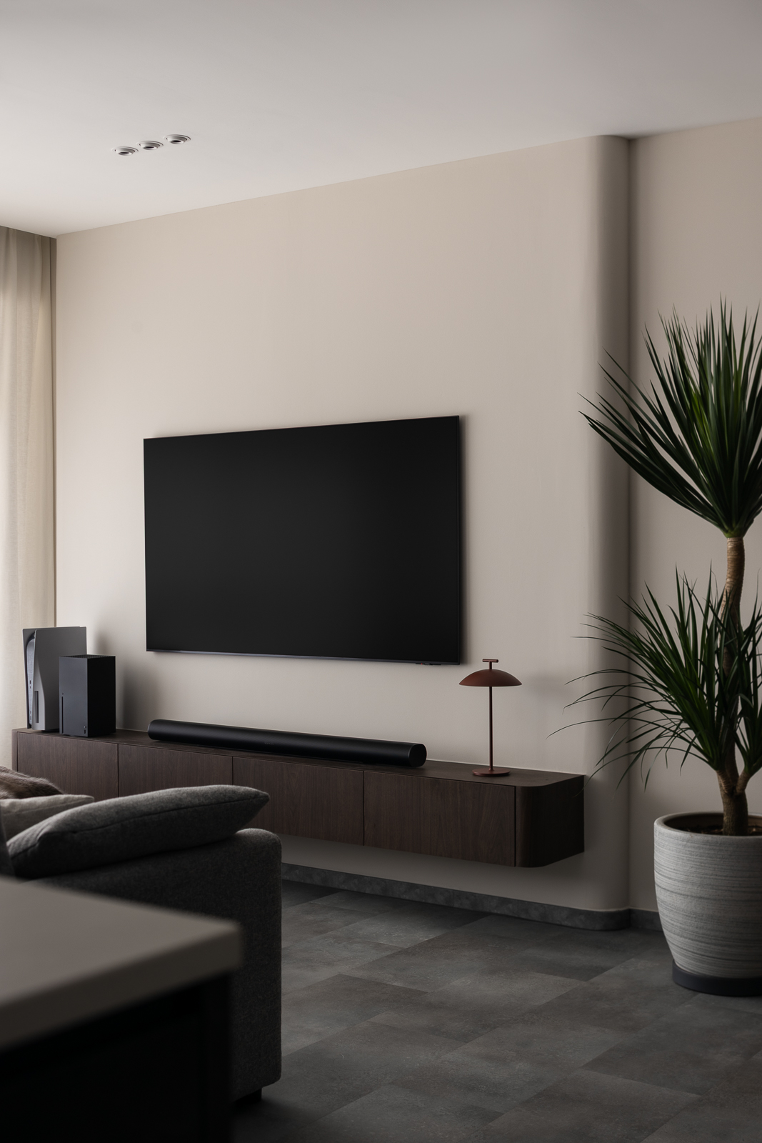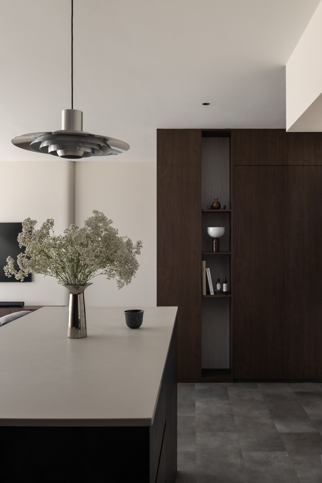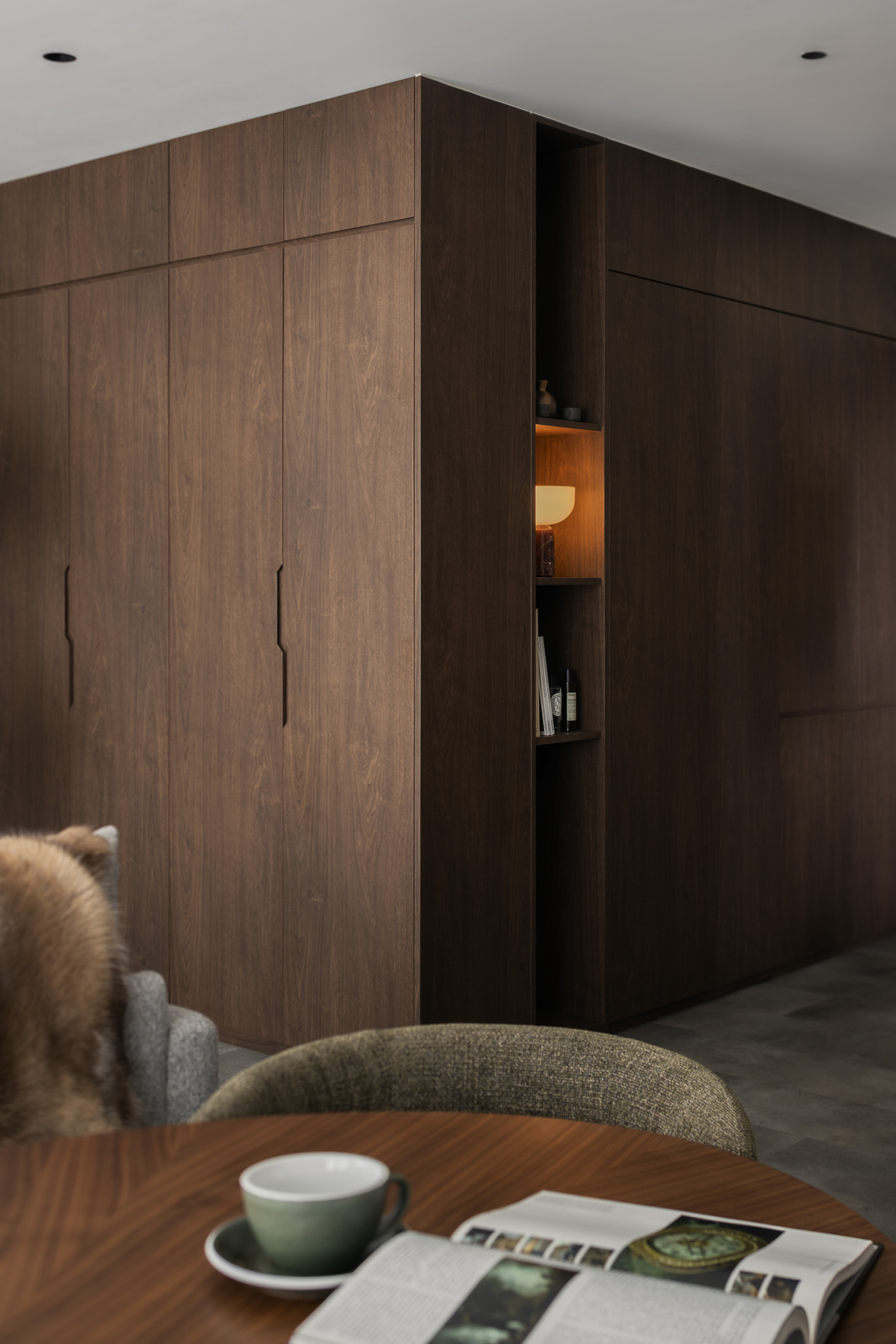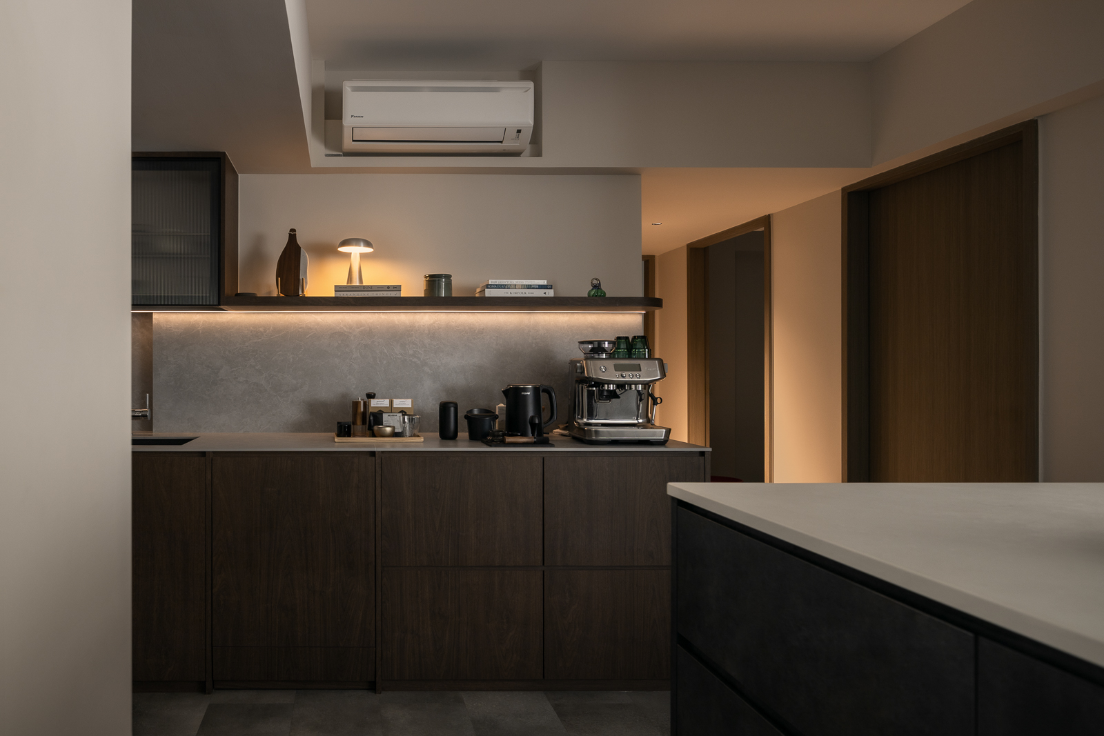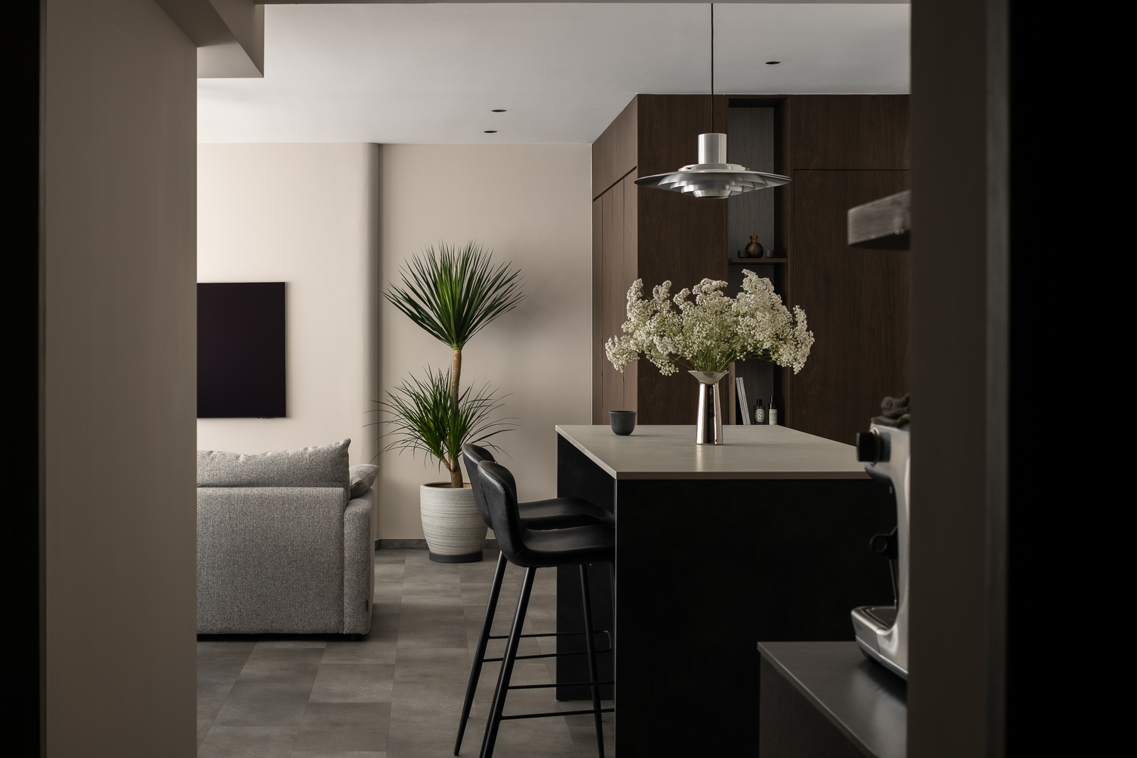 This dark minimalist home unfolds in an open-concept layout where neutral hues melt into deep walnut finishes, wrapping the space in warmth and blissful calm. The atmosphere is cosy yet refined — brought to life through organic textures and lighting that casts a gentle glow across every surface. Beautifully curated décor pieces complement the overall interior with grace and style. These accents sit harmoniously against the seamless carpentry design, where thoughtful storage solutions keep the environment elegantly clutter-free. The expansive communal area flows with ease, establishing a spacious and open zone designed for connection. Whether hosting social gatherings or simply sharing quiet moments at home, the kitchen island anchors the space while maintaining the clean silhouettes central to minimalist living. Strategic lighting placement plays a pivotal role throughout the home — highlighting textures, framing architectural lines and gently guiding the eye through each thoughtfully defined space. Kept intentionally minimal, the master bedroom features a sleek built-in wardrobe in contrast to the master bathroom which takes on a hint of opulence. Black marble tiles introduce tactile drama, balanced by walnut tones that echo the homes’ overarching warmth. With an emphasis on a modular design approach, this impeccable dwelling remains timeless that allows for flexibility over time with minimalism as its core foundation.