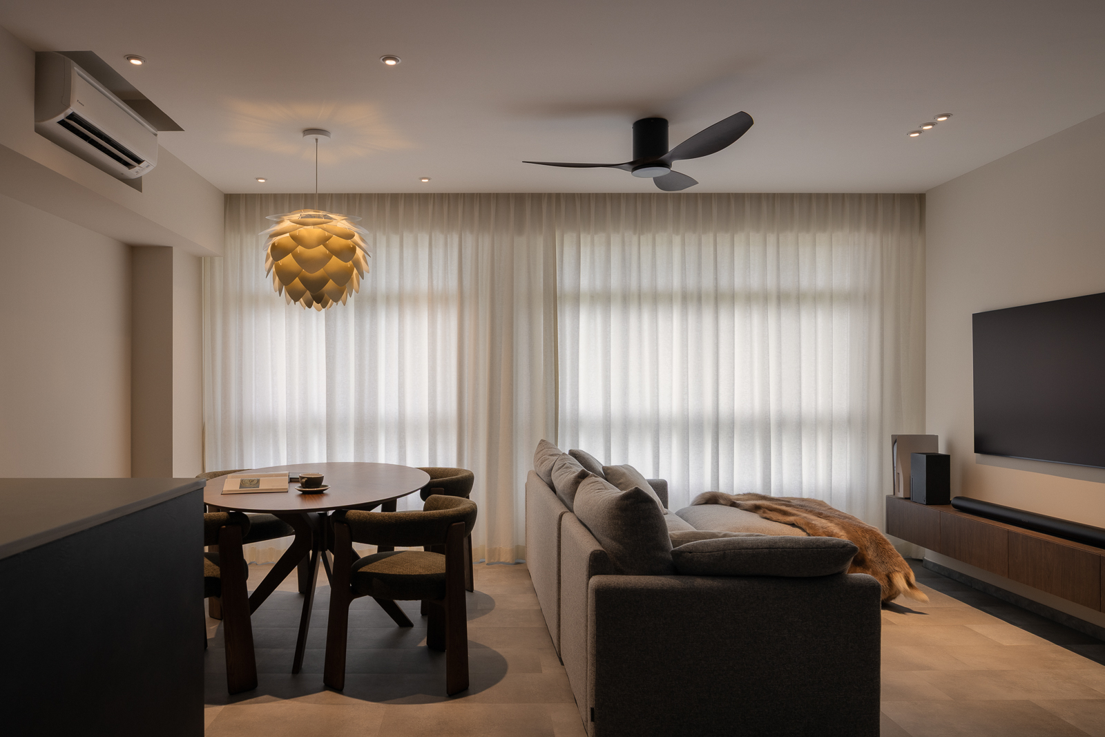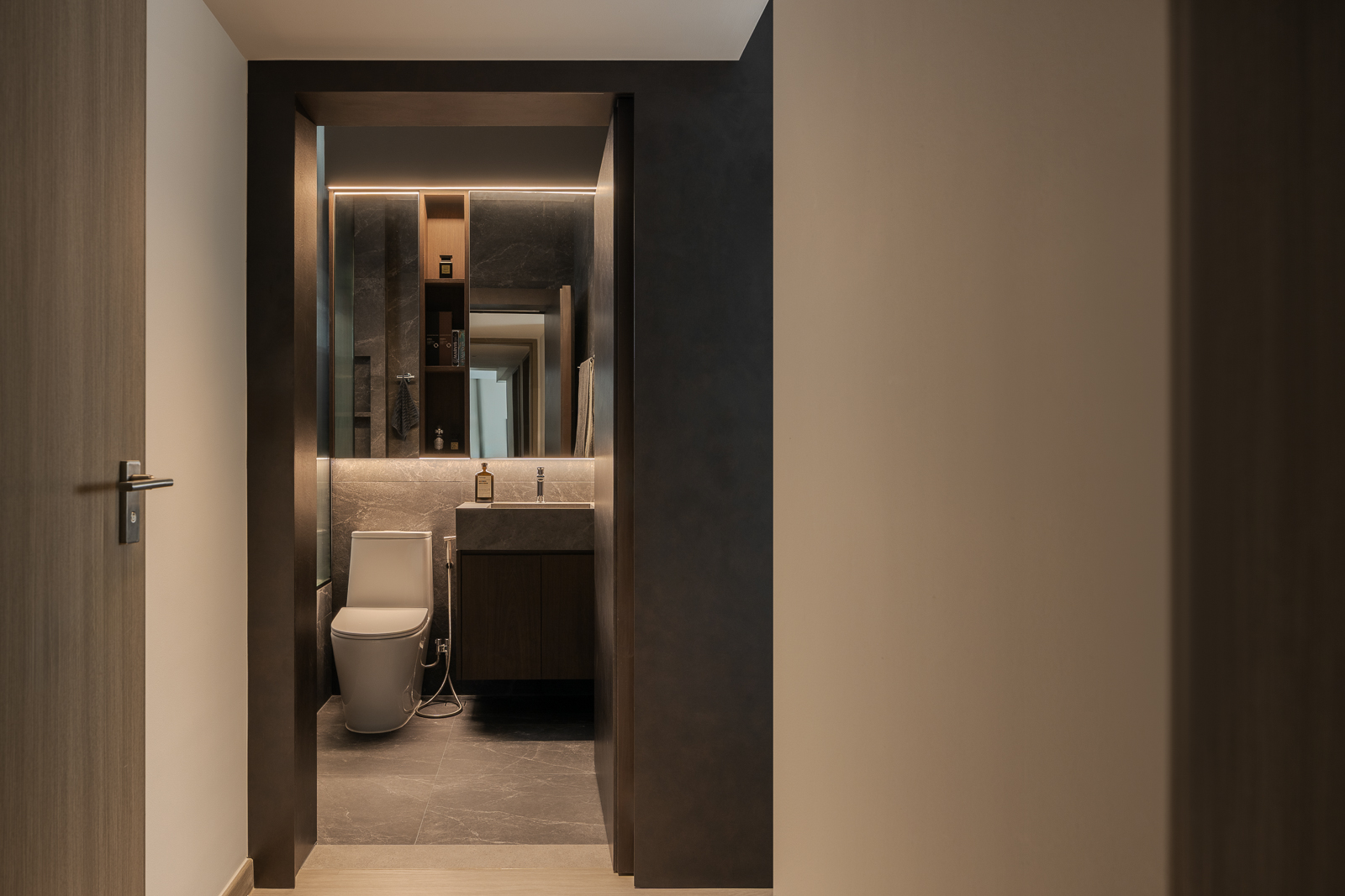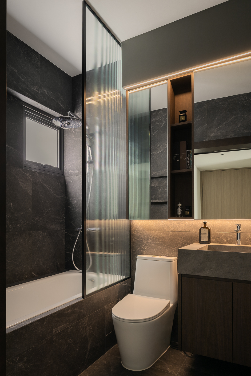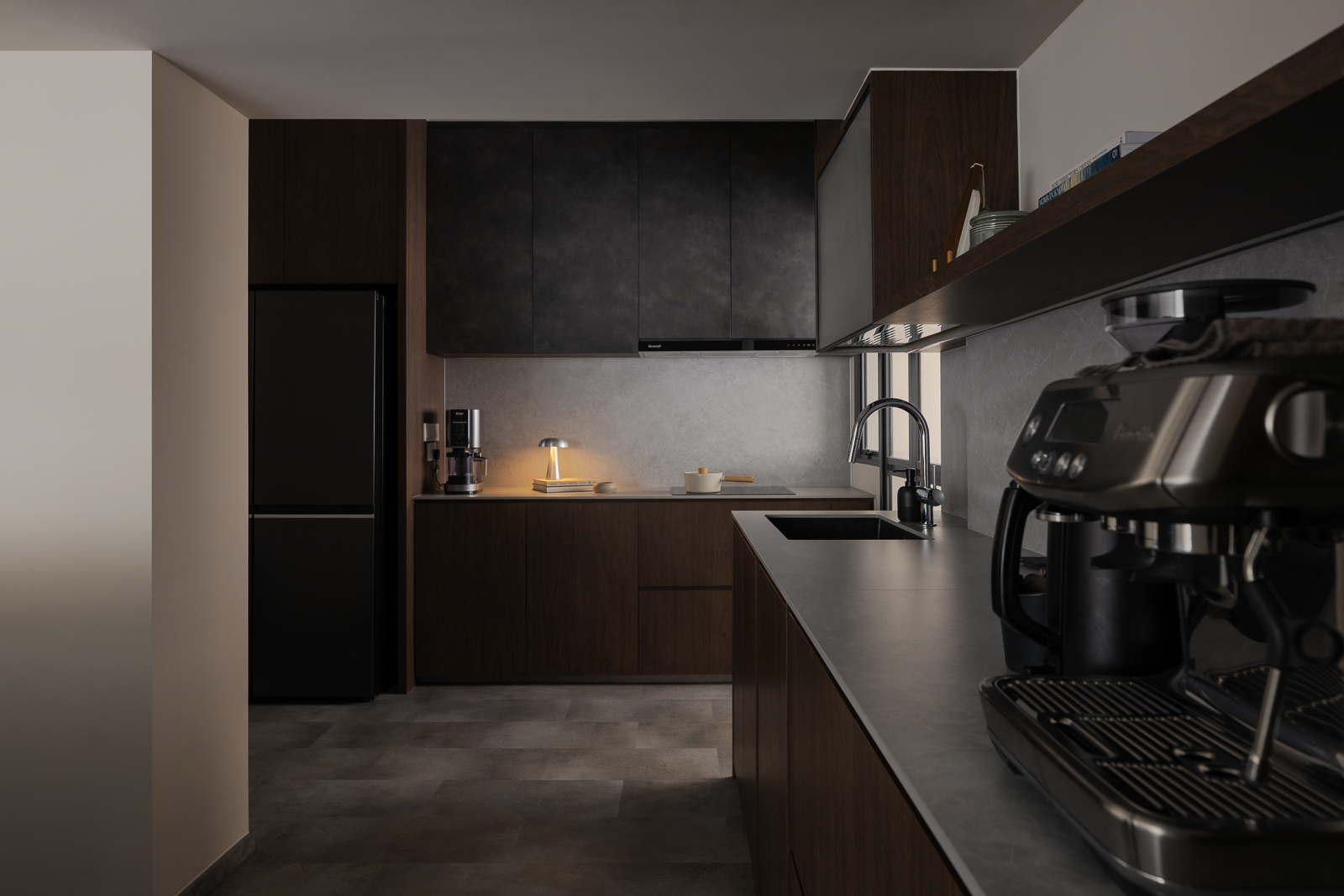 The main design brief consists of an open-concept layout with a walnut finish. To achieve this, the interior designer focused on practical storage solutions, seamless carpentry and neutral tones that complements the darker theme. The entryway carpentry was designed to hide the DB box and bomb shelter with added niches to create depth and display their decorative items. This extended into the living area, where a sleek TV feature wall conceals all wiring. Small touches like the seamless carpentry and the introduction of greenery helped soften the minimalist look. In the kitchen, the layout was reconfigured for better flow by hacking a wall to create two entrances and aligning the island with the wall for visual balance. Additional countertop space, concealed storage and sintered stone finishes were selected for both aesthetics and durability. For the master bathroom, the designer used dark walnut tones and black marble tiles, integrating a bathtub and a custom niche to maximise limited space. The common bathroom was given a lighter palette with kit-kat tiles and a solid wall separating wet and dry areas for easier maintenance.
