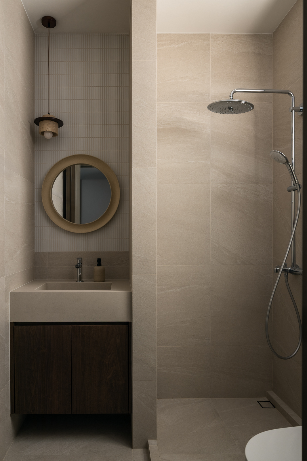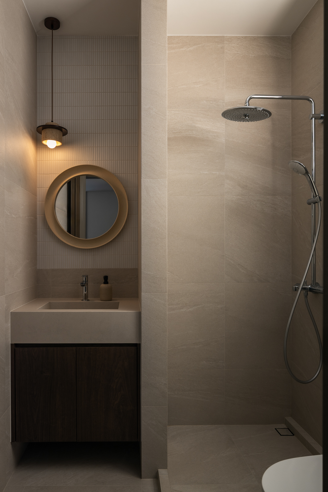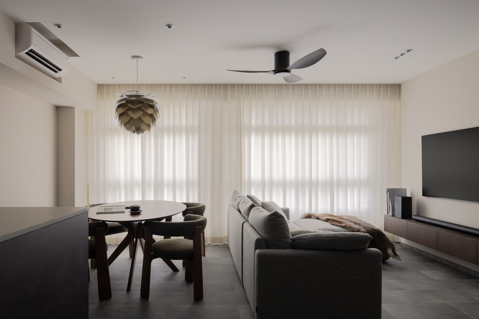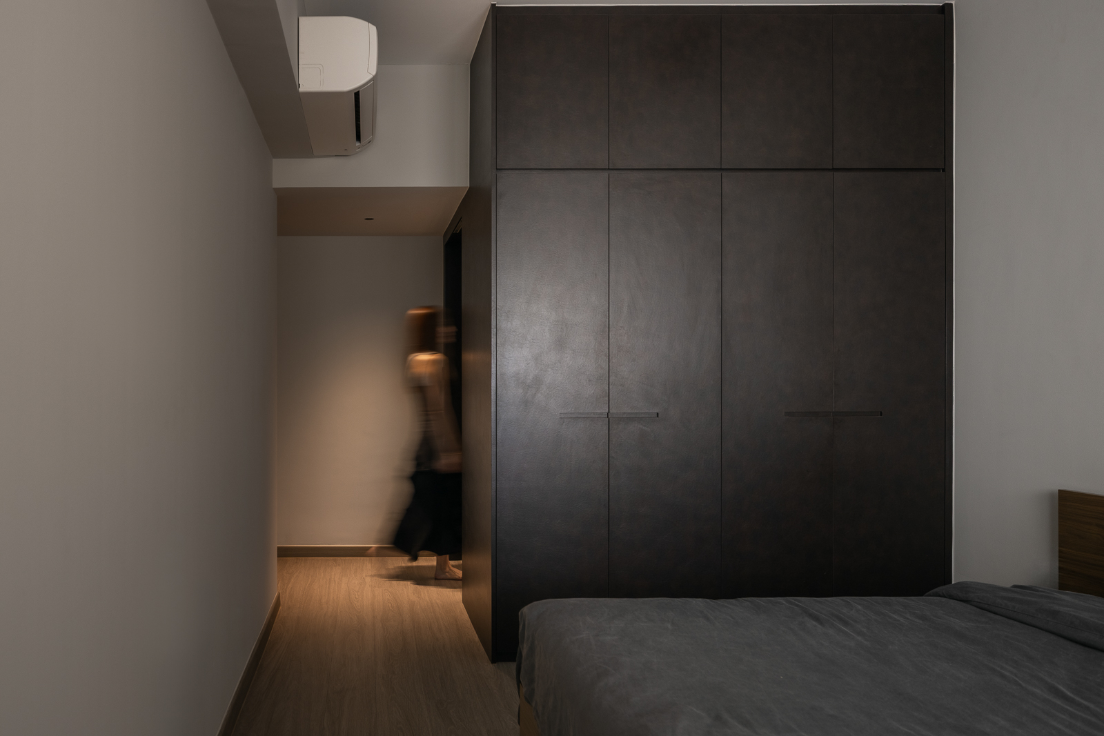 The main design brief consists of an open-concept layout with a walnut finish. To achieve this, the interior designer focused on practical storage solutions, seamless carpentry and neutral tones that complements the darker theme. The entryway carpentry was designed to hide the DB box and bomb shelter with added niches to create depth and display their decorative items. This extended into the living area, where a sleek TV feature wall conceals all wiring. Small touches like the seamless carpentry and the introduction of greenery helped soften the minimalist look. In the kitchen, the layout was reconfigured for better flow by hacking a wall to create two entrances and aligning the island with the wall for visual balance. Additional countertop space, concealed storage and sintered stone finishes were selected for both aesthetics and durability. For the master bathroom, the designer used dark walnut tones and black marble tiles, integrating a bathtub and a custom niche to maximise limited space. The common bathroom was given a lighter palette with kit-kat tiles and a solid wall separating wet and dry areas for easier maintenance.