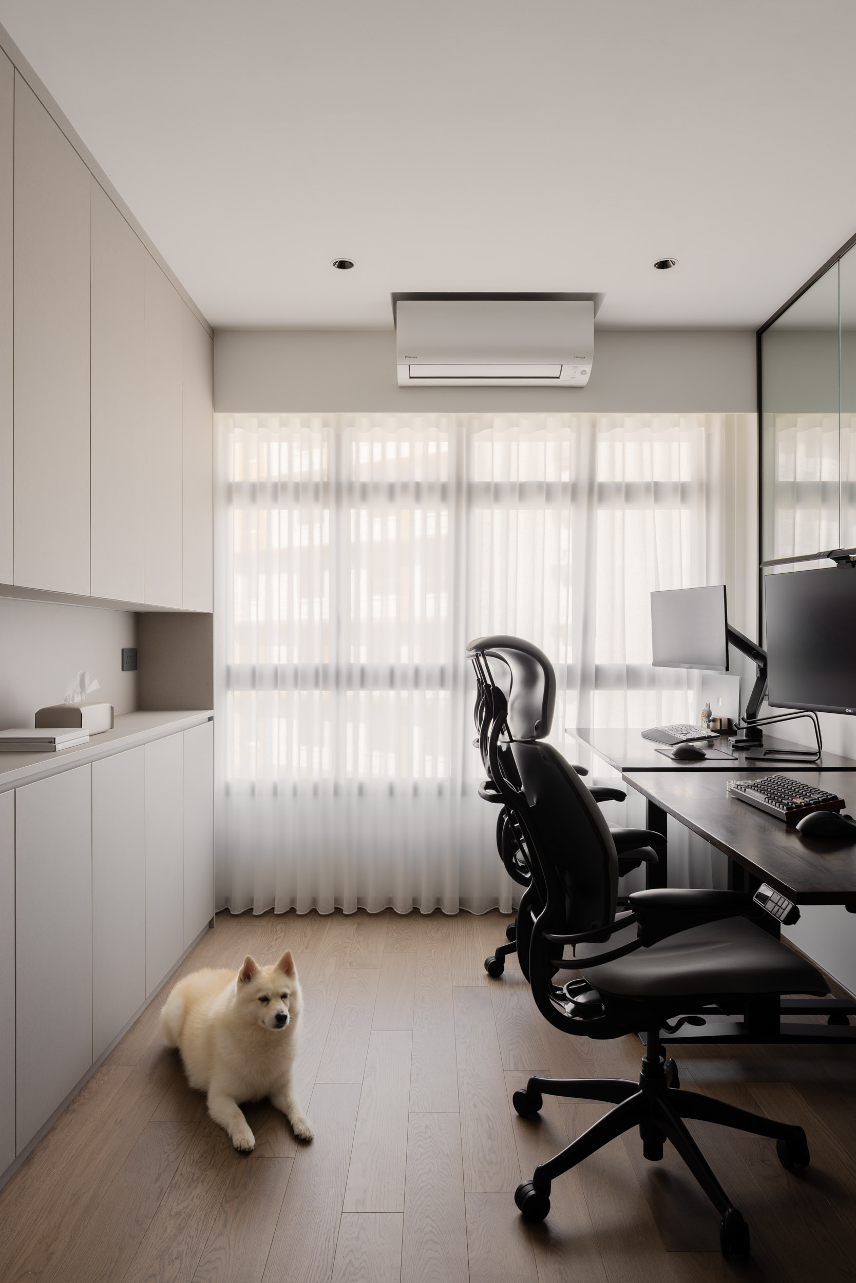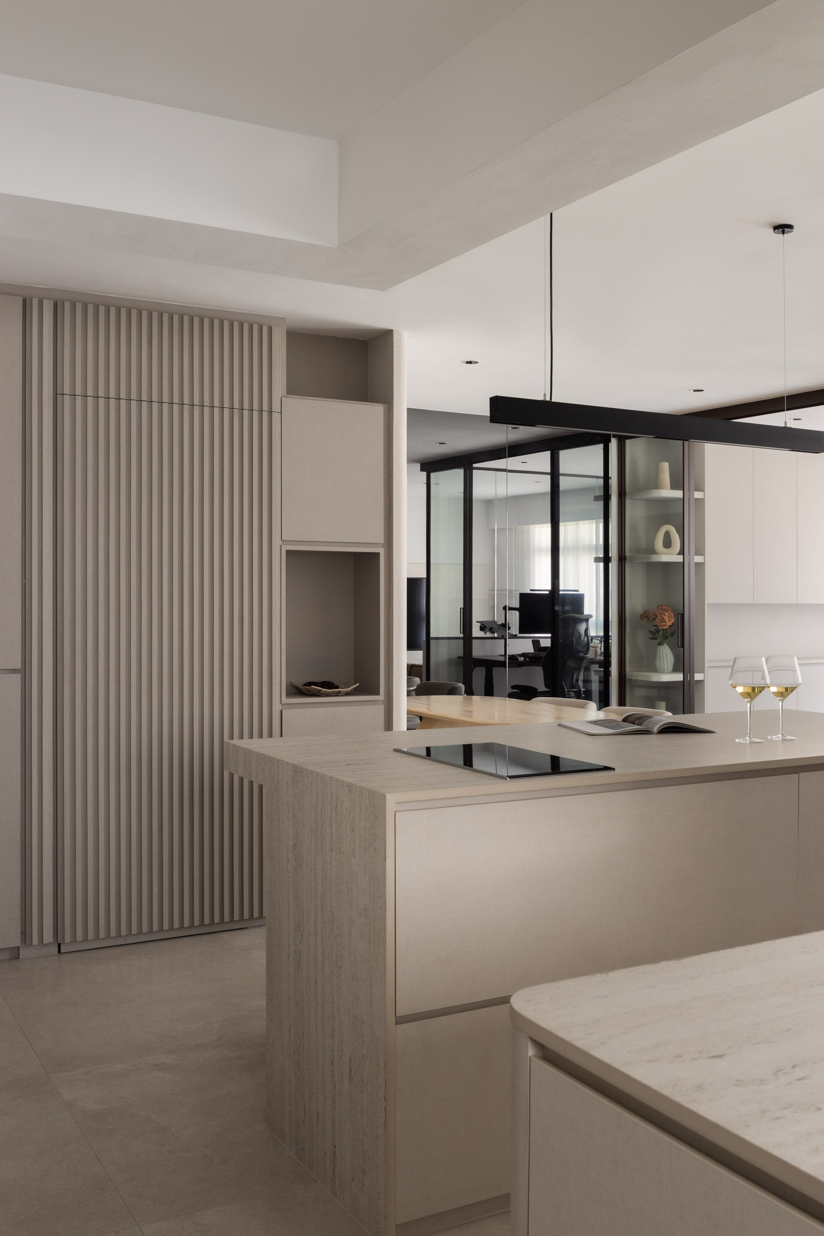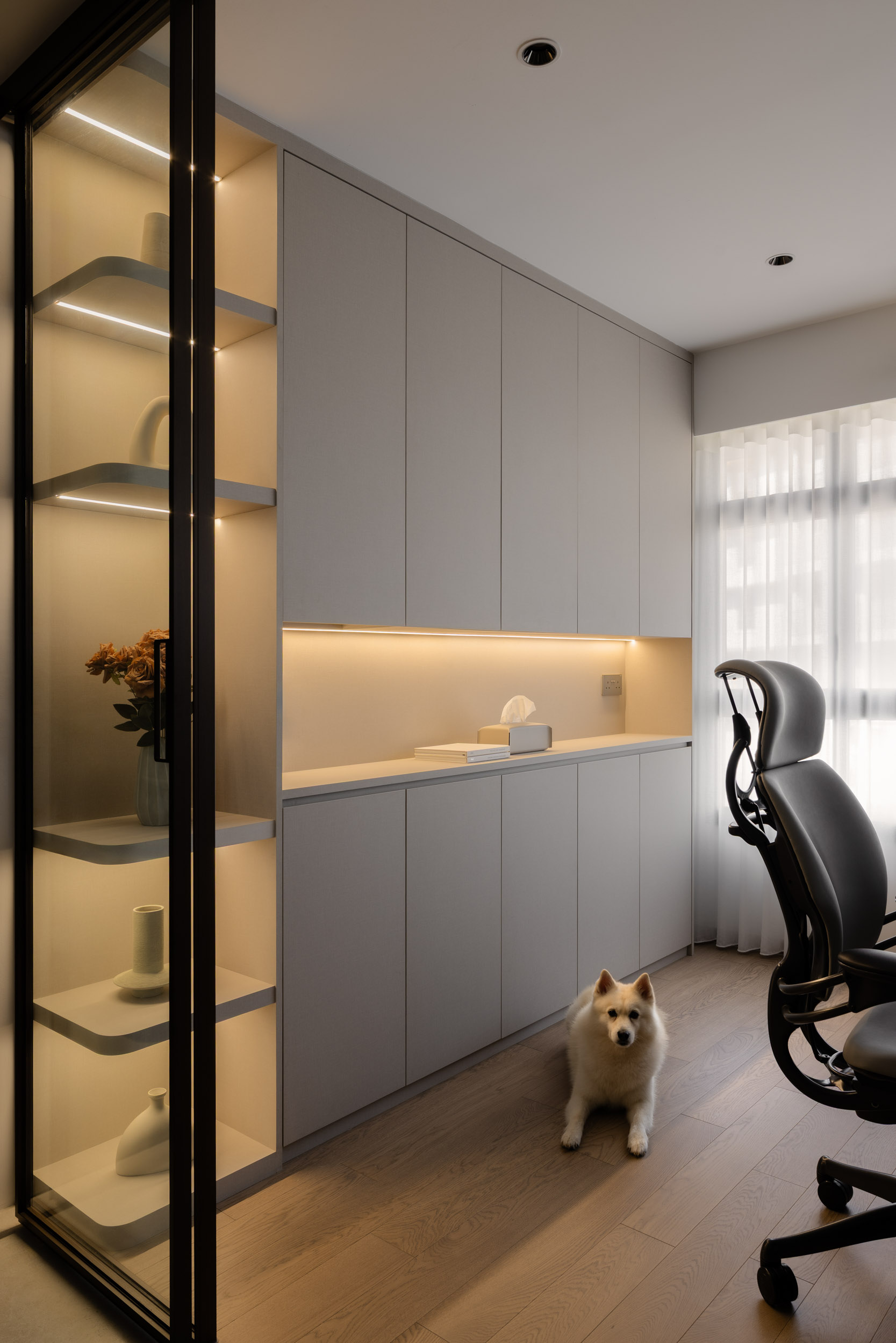 Once enclosed, the kitchen was opened up to accommodate a generous waterfall island — now the heart of the home and an anchor for hosting and everyday living. Beside it, the living room features a sleek TV feature wall with a built-in console, presenting a clean, understated backdrop. Adjacent to the living room, the study is enclosed in glass and framed with subtle wood detailing, offering privacy without sacrificing openness.