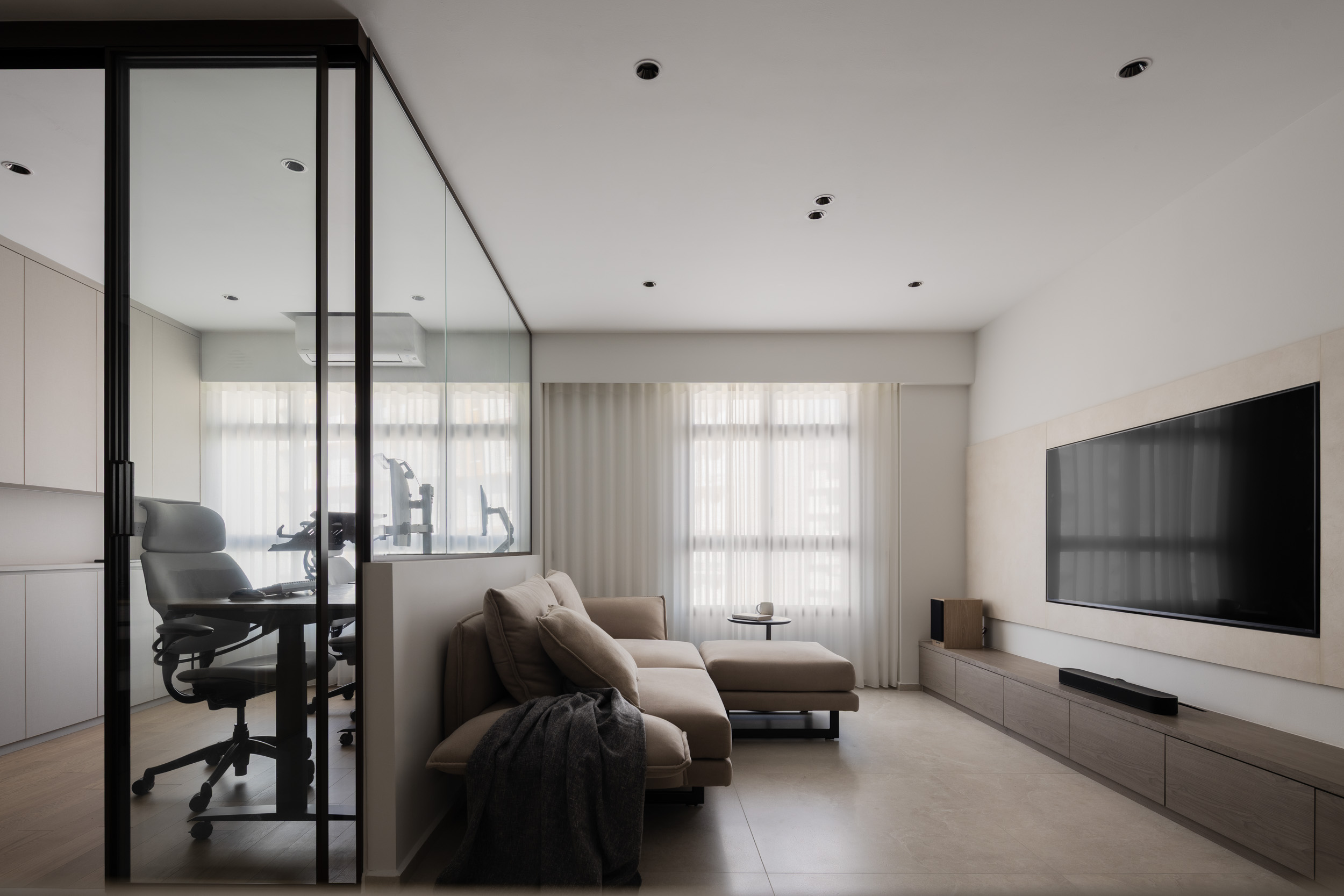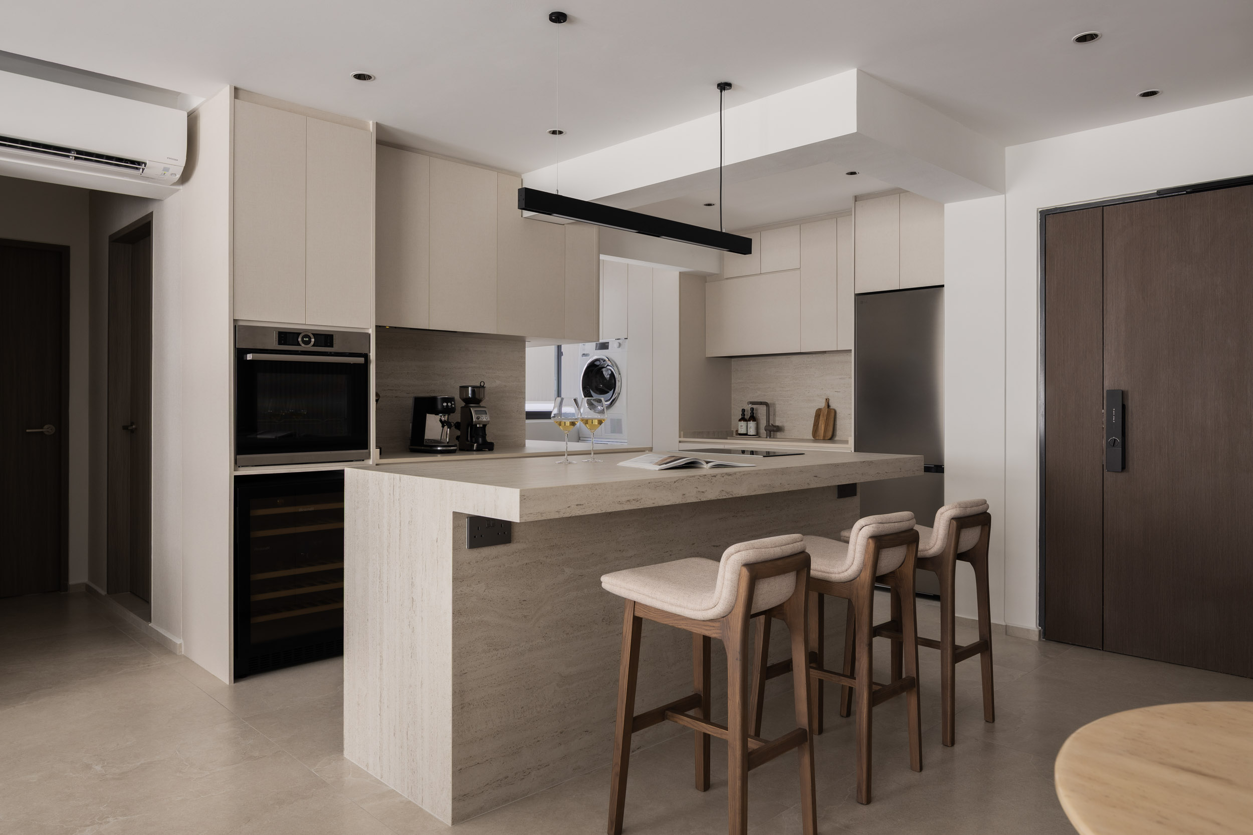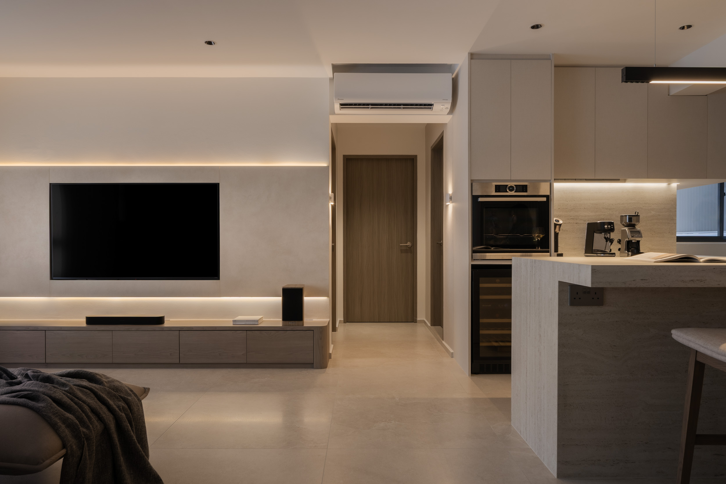 Soft creams, beige hues, and light wood accents shape the foundation of this modern contemporary 4-room HDB home, creating a space that feels inviting, balanced, and beautifully refined. The tonal consistency flows throughout the space, from the communal area to the travertine-clad bathrooms, creating a seamless visual harmony.