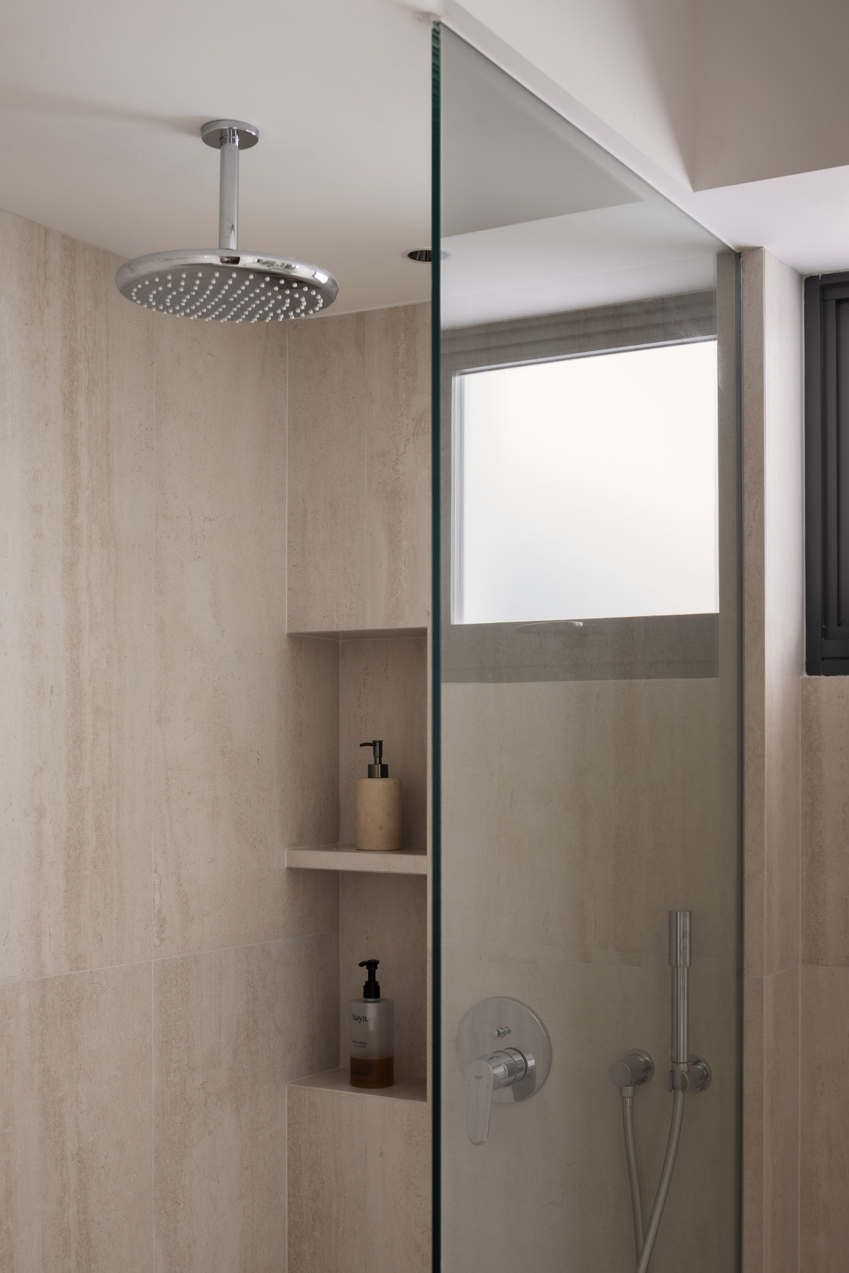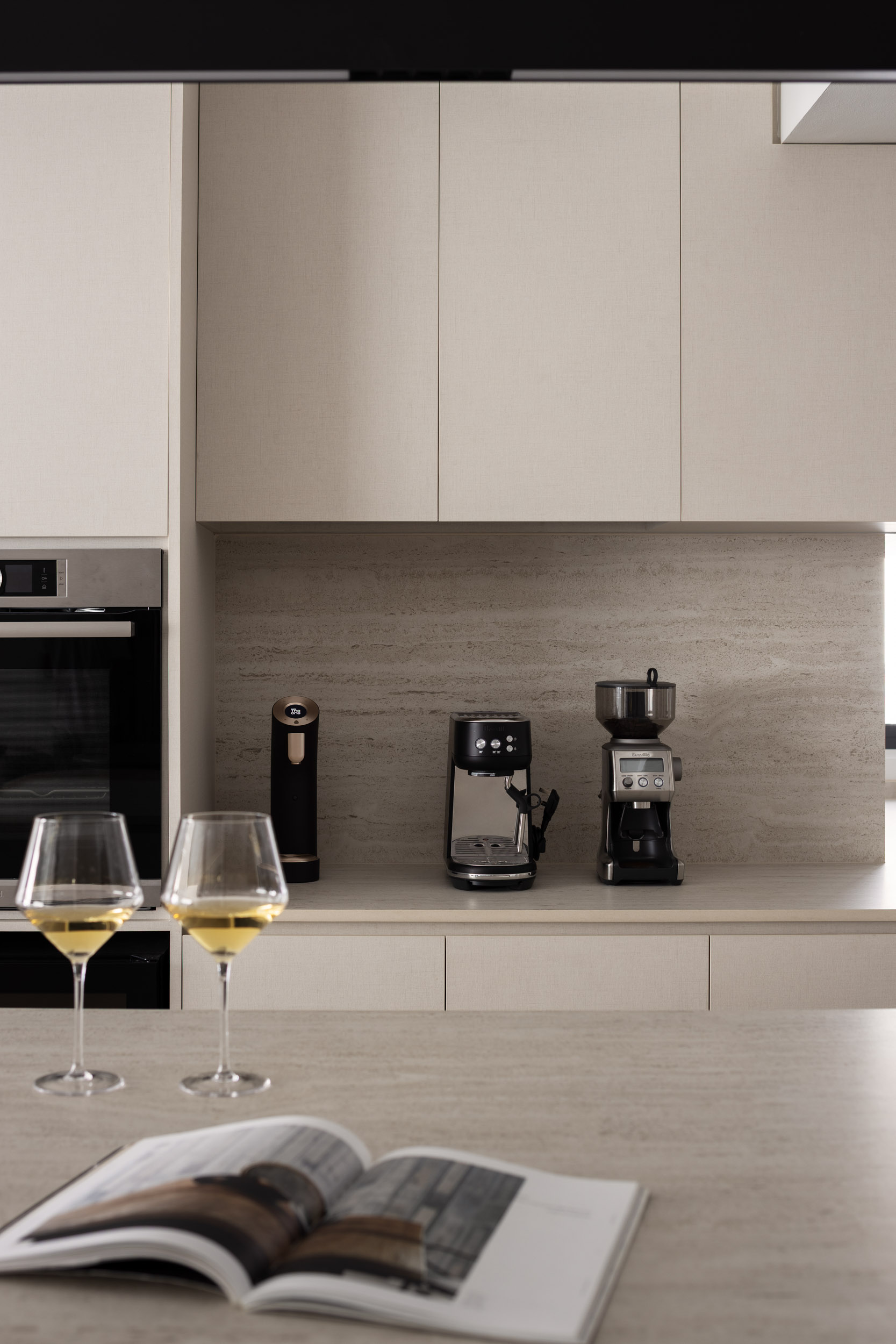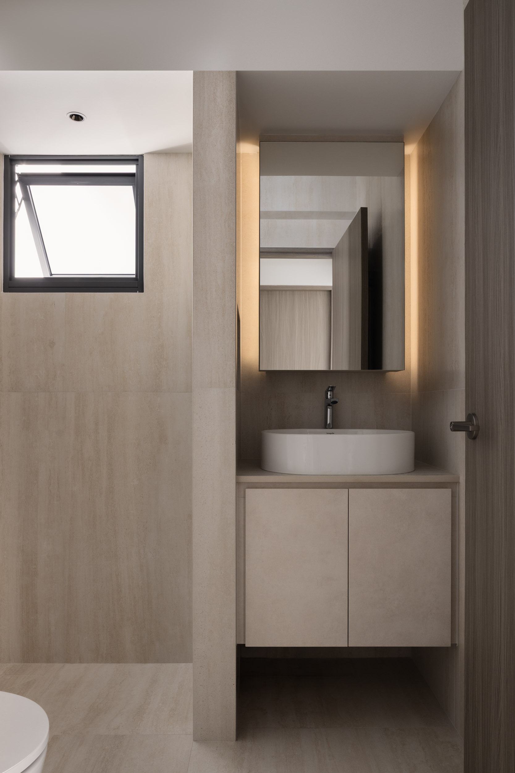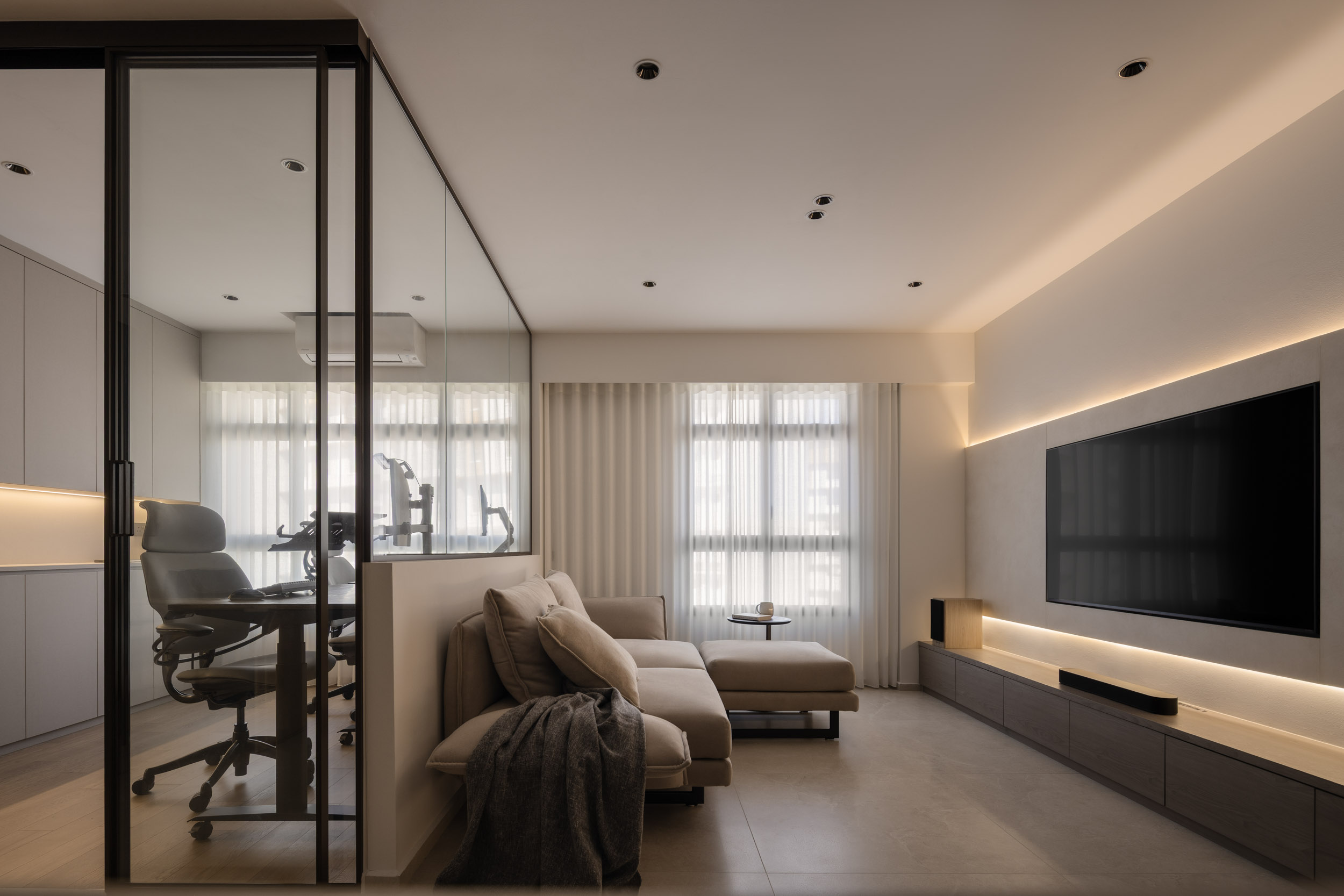 Soft creams, beige hues, and light wood accents shape the foundation of this modern contemporary 4-room HDB home, creating a space that feels inviting, balanced, and beautifully refined. The tonal consistency flows throughout the space, from the communal area to the travertine-clad bathrooms, creating a seamless visual harmony.