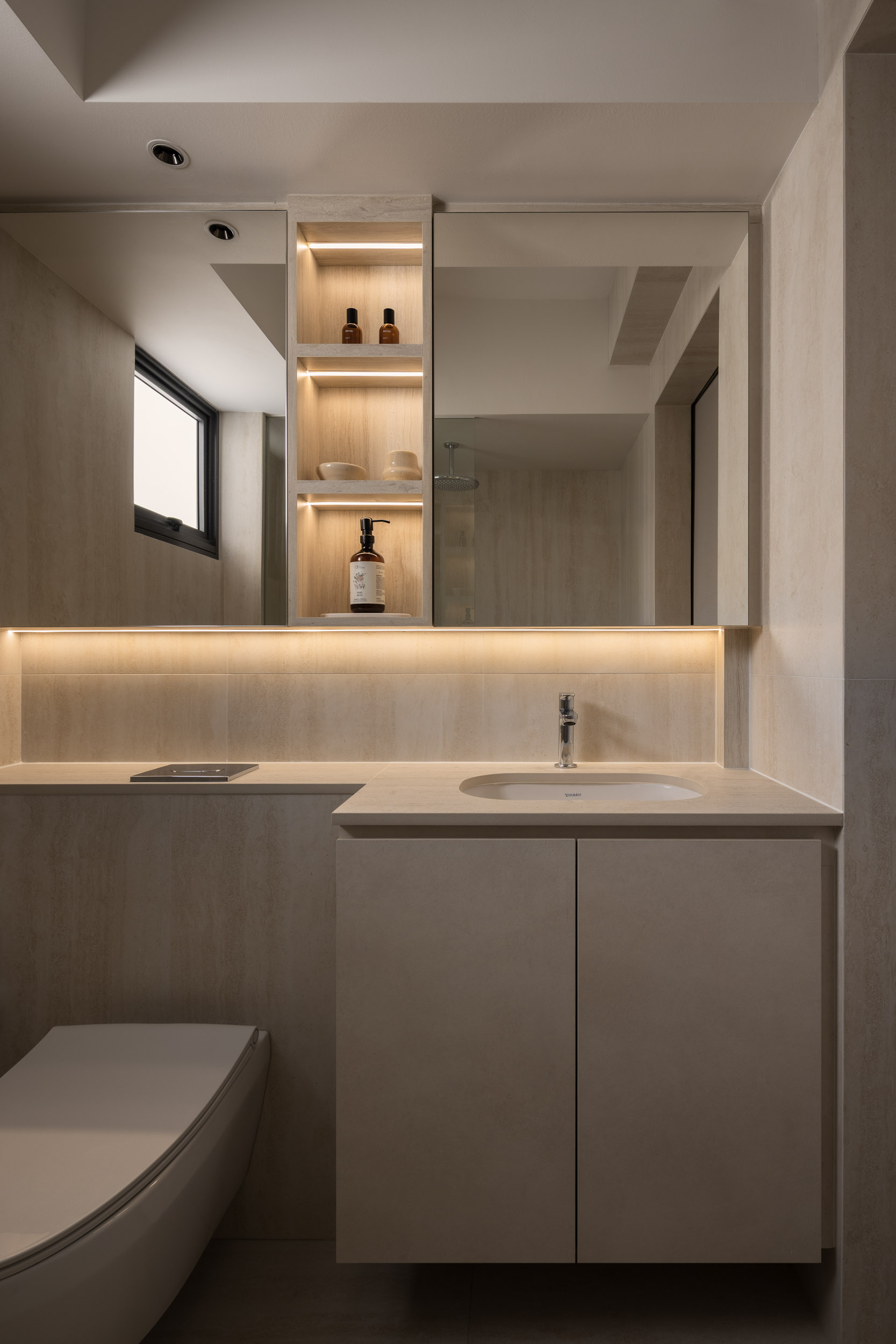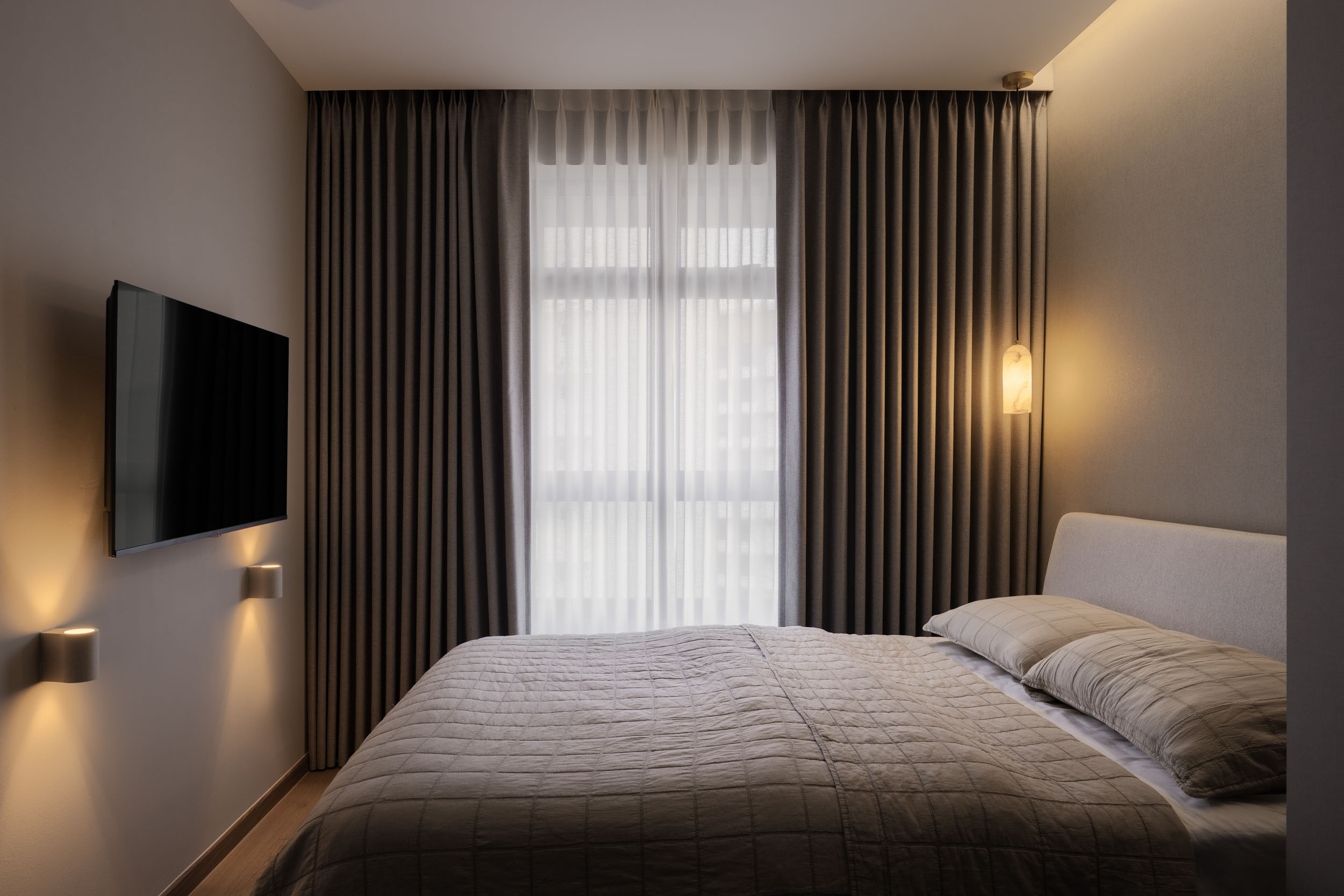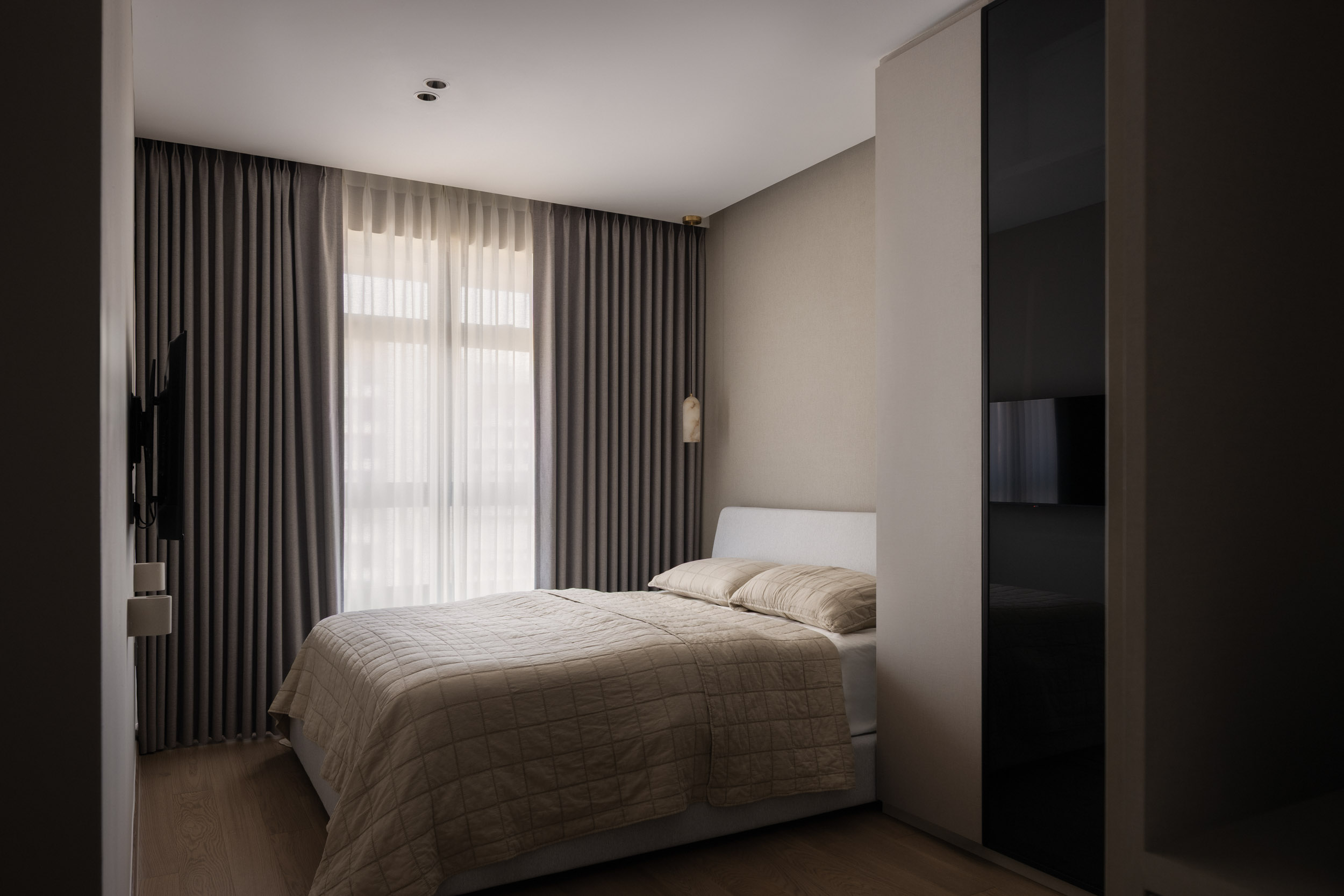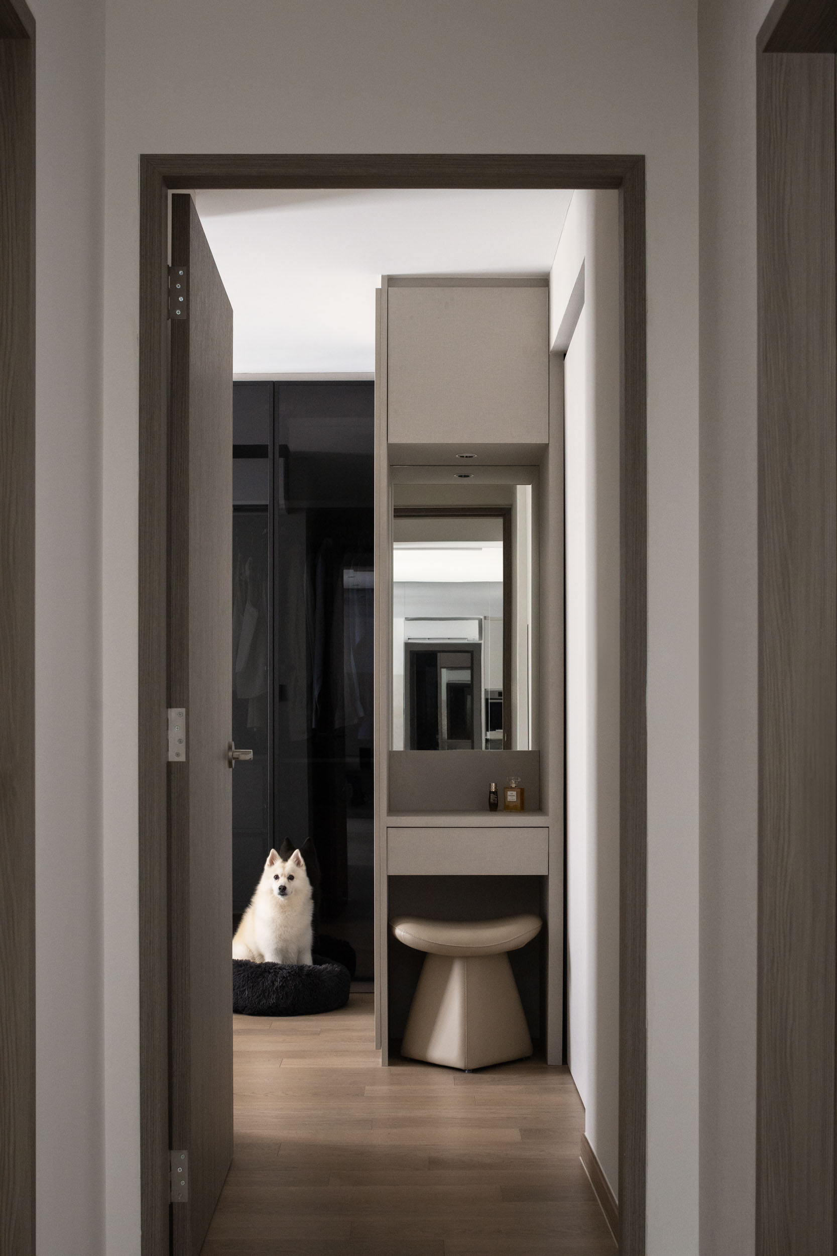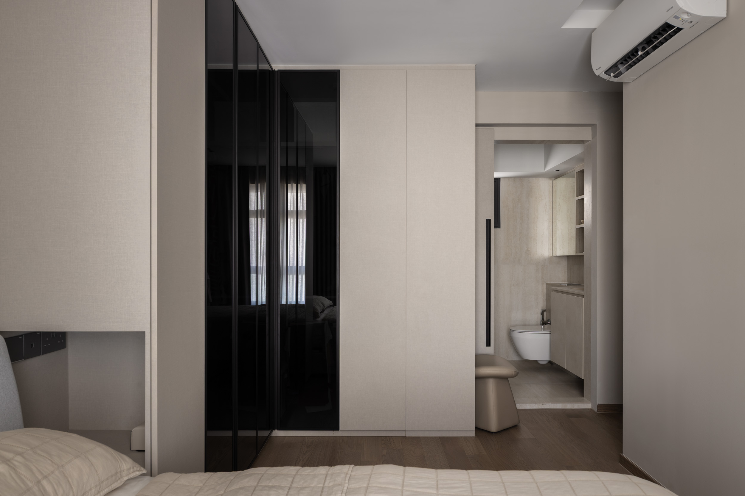 In the master bedroom, thoughtful built-in features elevate both function and form. A vanity is seamlessly integrated into the side of the wardrobe, maintaining an uncluttered silhouette. The bedside table, cleverly concealed within the wardrobe structure, keeps essentials tucked away and preserves the room’s streamlined tranquillity.