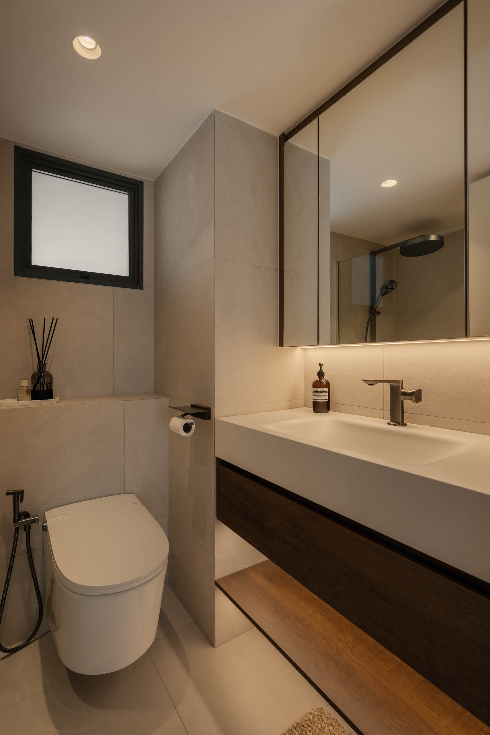 Even the finishing touches were chosen with care. Large-format bathroom tiles reduce grout lines for a smooth look, while recessed handles keep cabinetry surfaces sleek. The result is a home that’s not only calm and minimal but genuinely easy to live in.