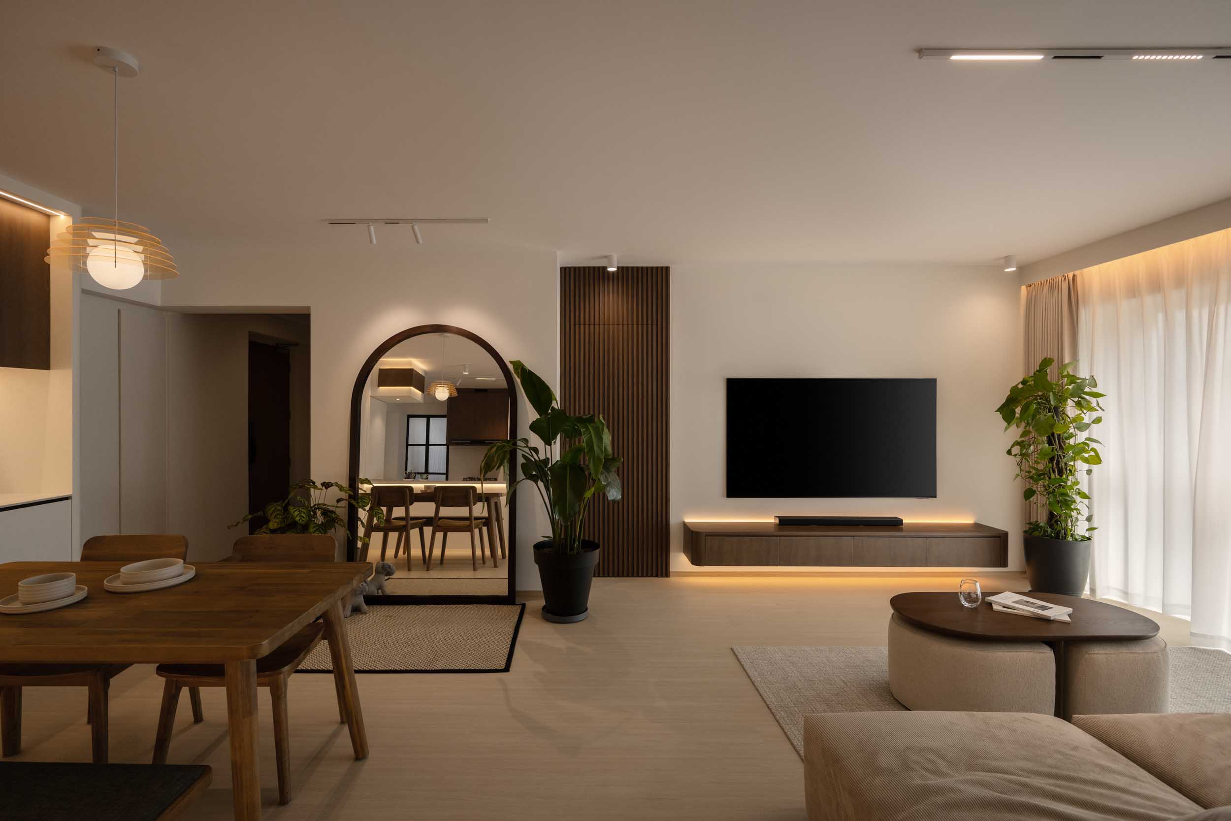 Wood fluted panels introduce texture at the entrance and TV wall. They’re not just pretty: these panels cleverly hide practical features, from the household shelter to extra storage behind the TV wall, keeping the home tidy and effortlessly functional.