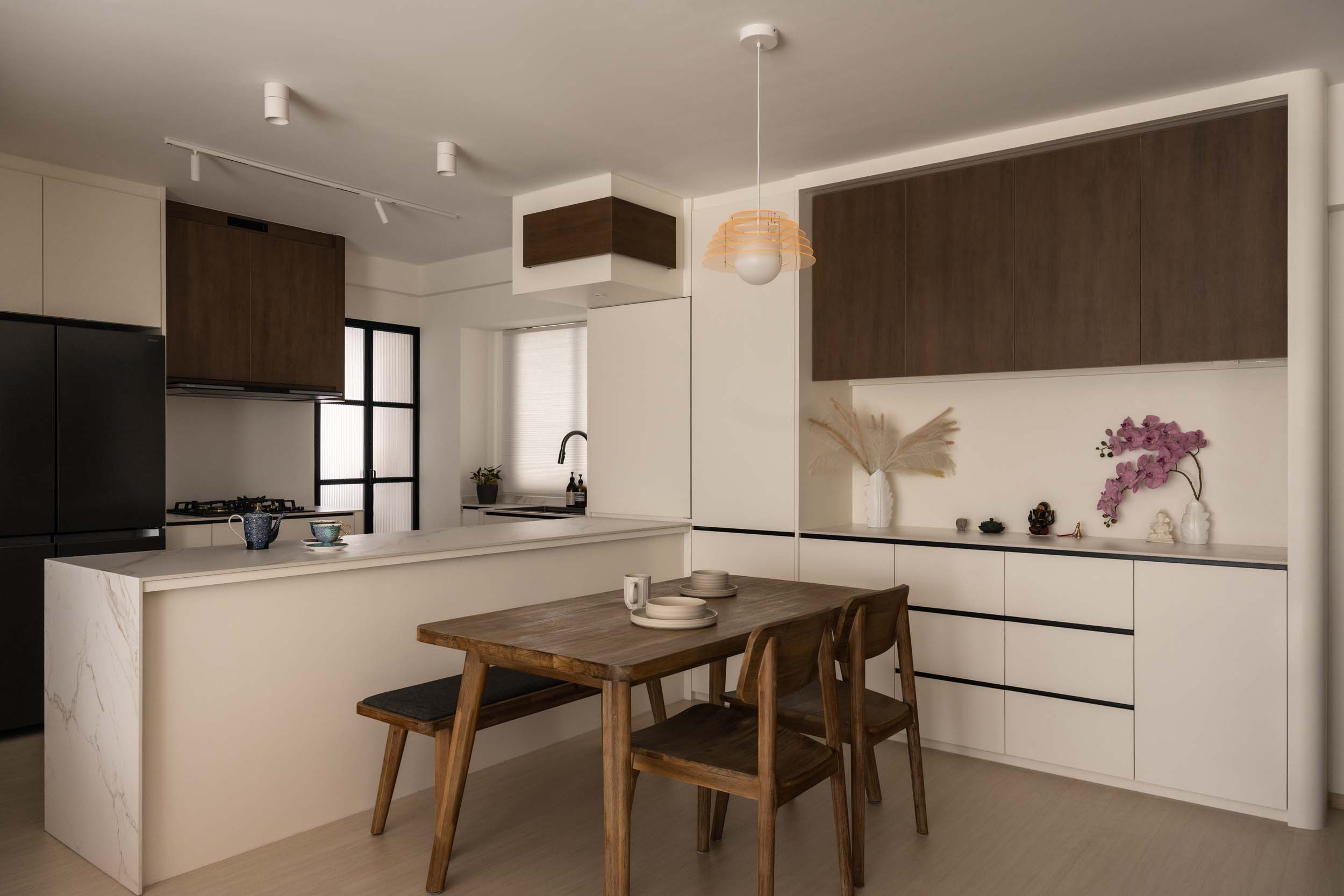 Lighting is layered and understated. A simple pendant light defines the dining area, while LED strips tucked into cabinetry give a soft, ambient glow. Pockets of greenery bring life into the clean-lined space, giving the home a lived-in, welcoming feel.
