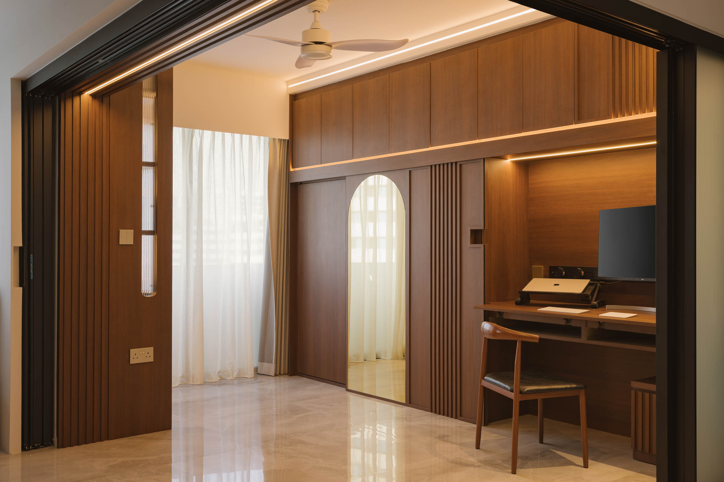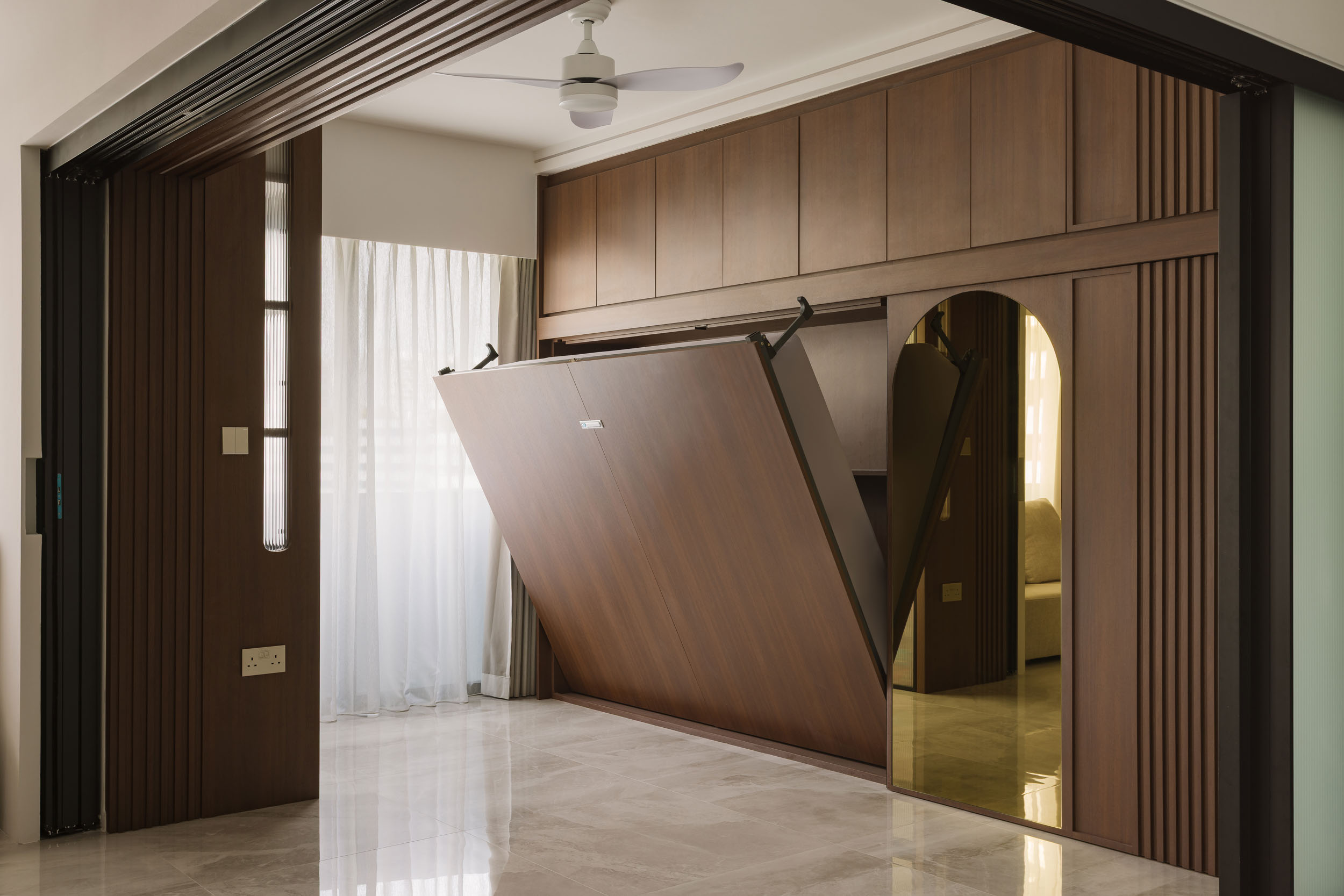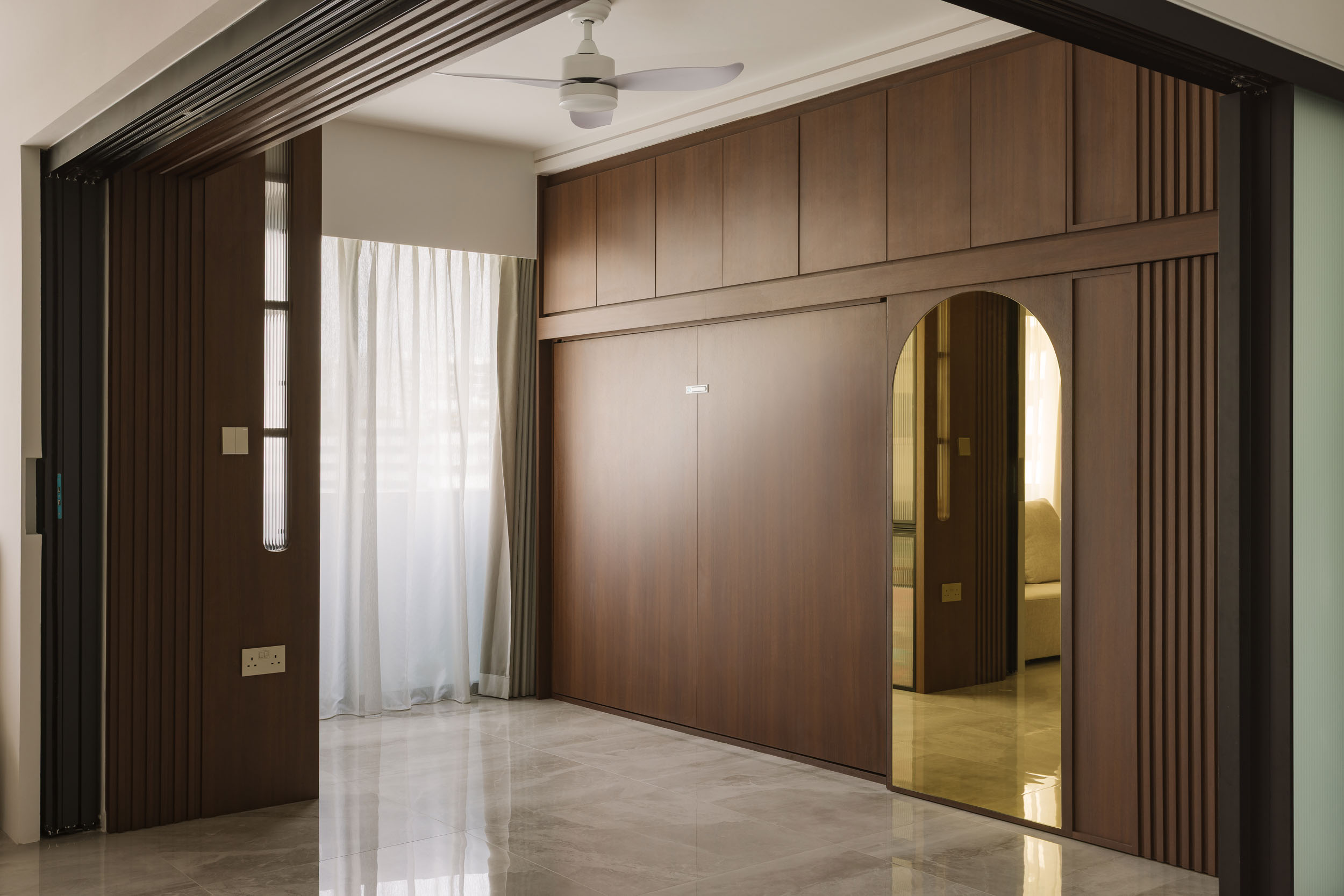 This project involved the extensive renovation of an existing resale unit, where the homeowners sought to refresh the majority of the home with a modern luxury aesthetic while optimising the space for multi-purpose use. To achieve this, one of the walls of the common bedrooms was hacked to enlarge the living area, allowing sufficient space to integrate a Murphy bed and a dedicated work station. The second common bedroom was intentionally left untouched to preserve flexibility for future use. A consistent design theme was applied throughout the communal areas; characterised by warm wood tones, contemporary fixtures, and subtle textural contrasts to create an environment that is both inviting and cosy.