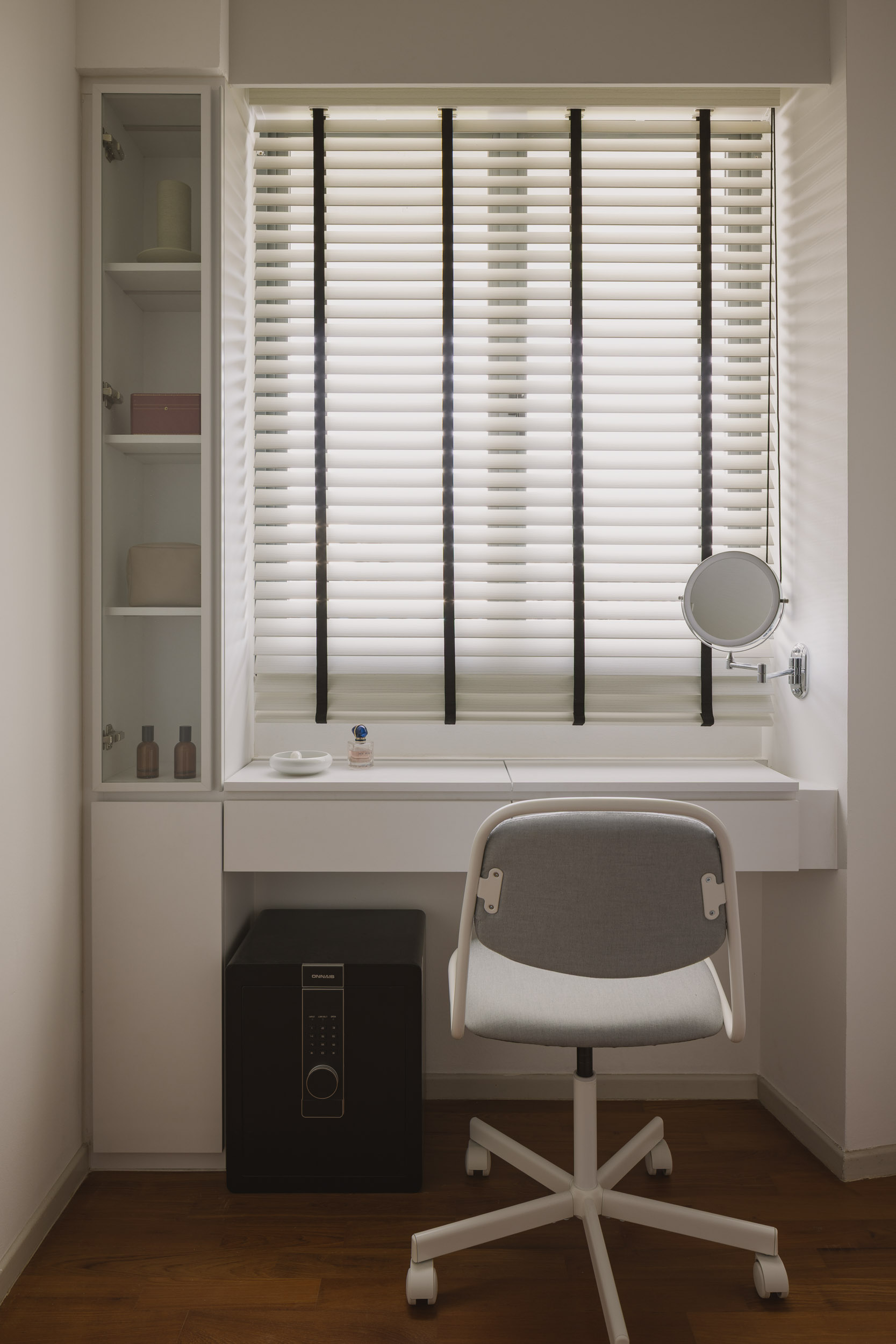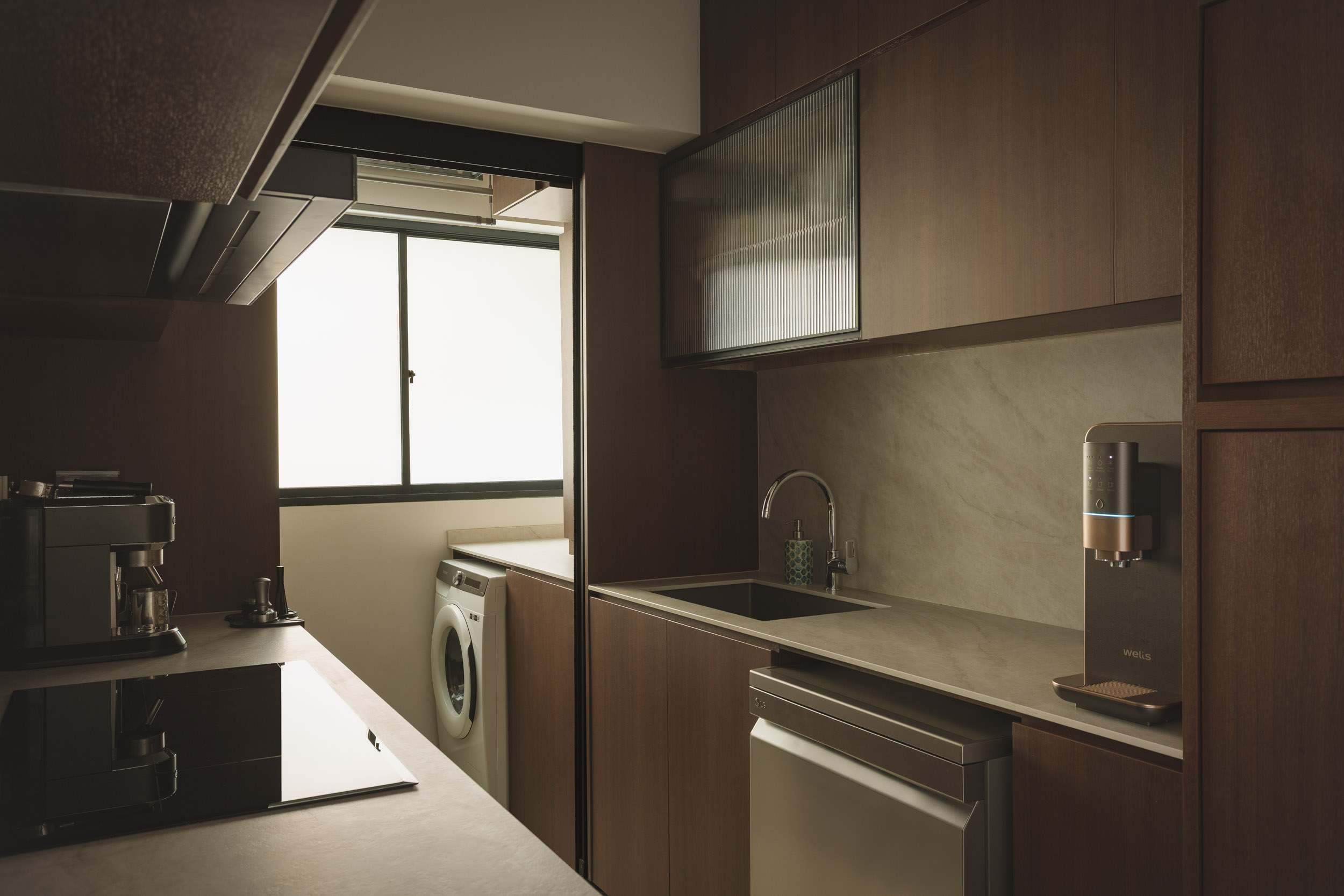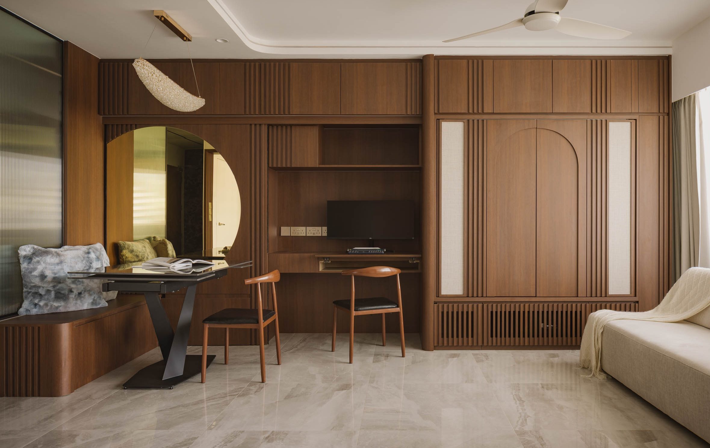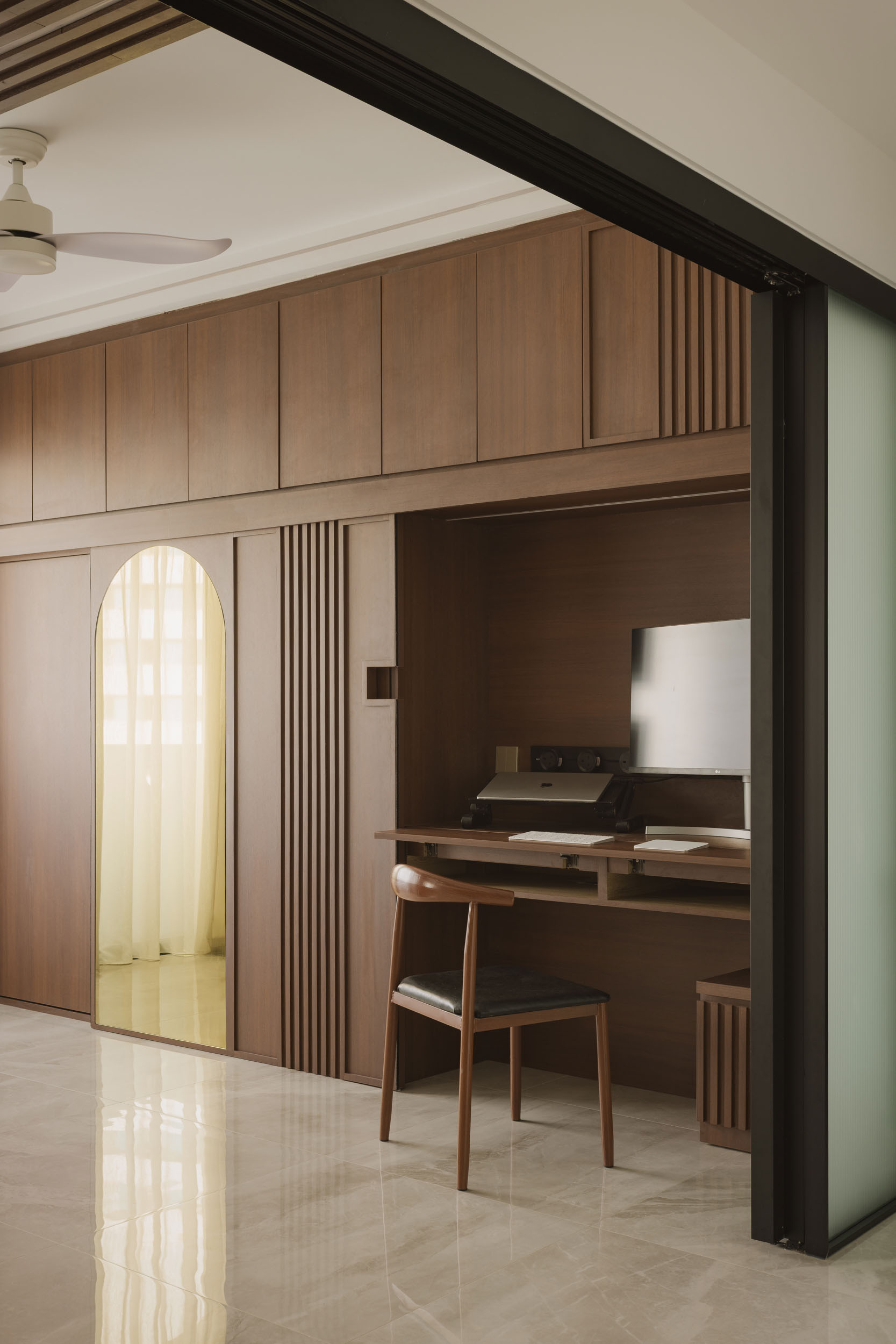 This project involved the extensive renovation of an existing resale unit, where the homeowners sought to refresh the majority of the home with a modern luxury aesthetic while optimising the space for multi-purpose use. To achieve this, one of the walls of the common bedrooms was hacked to enlarge the living area, allowing sufficient space to integrate a Murphy bed and a dedicated work station. The second common bedroom was intentionally left untouched to preserve flexibility for future use. A consistent design theme was applied throughout the communal areas; characterised by warm wood tones, contemporary fixtures, and subtle textural contrasts to create an environment that is both inviting and cosy.
