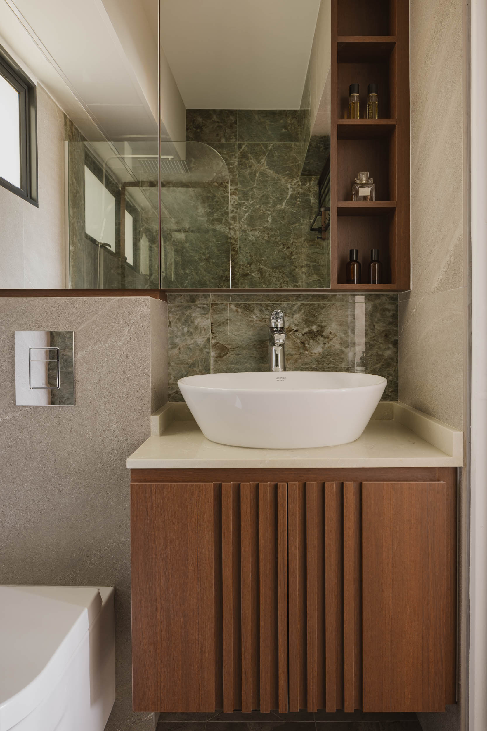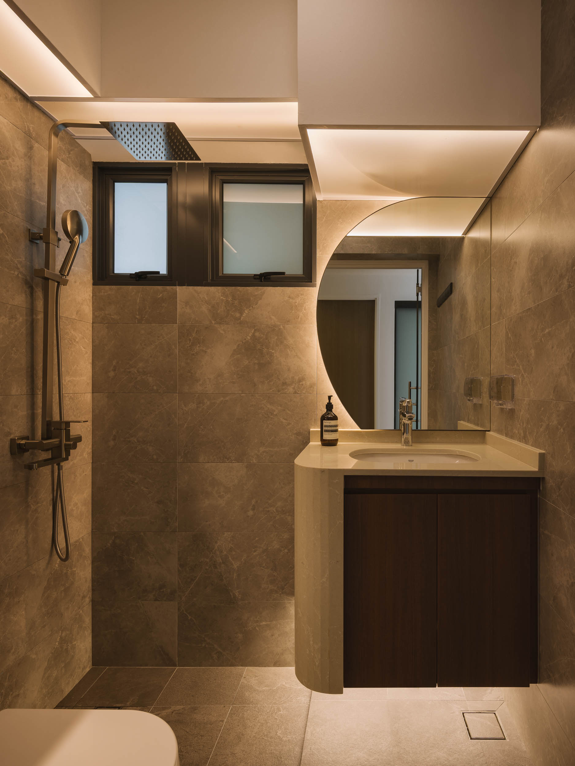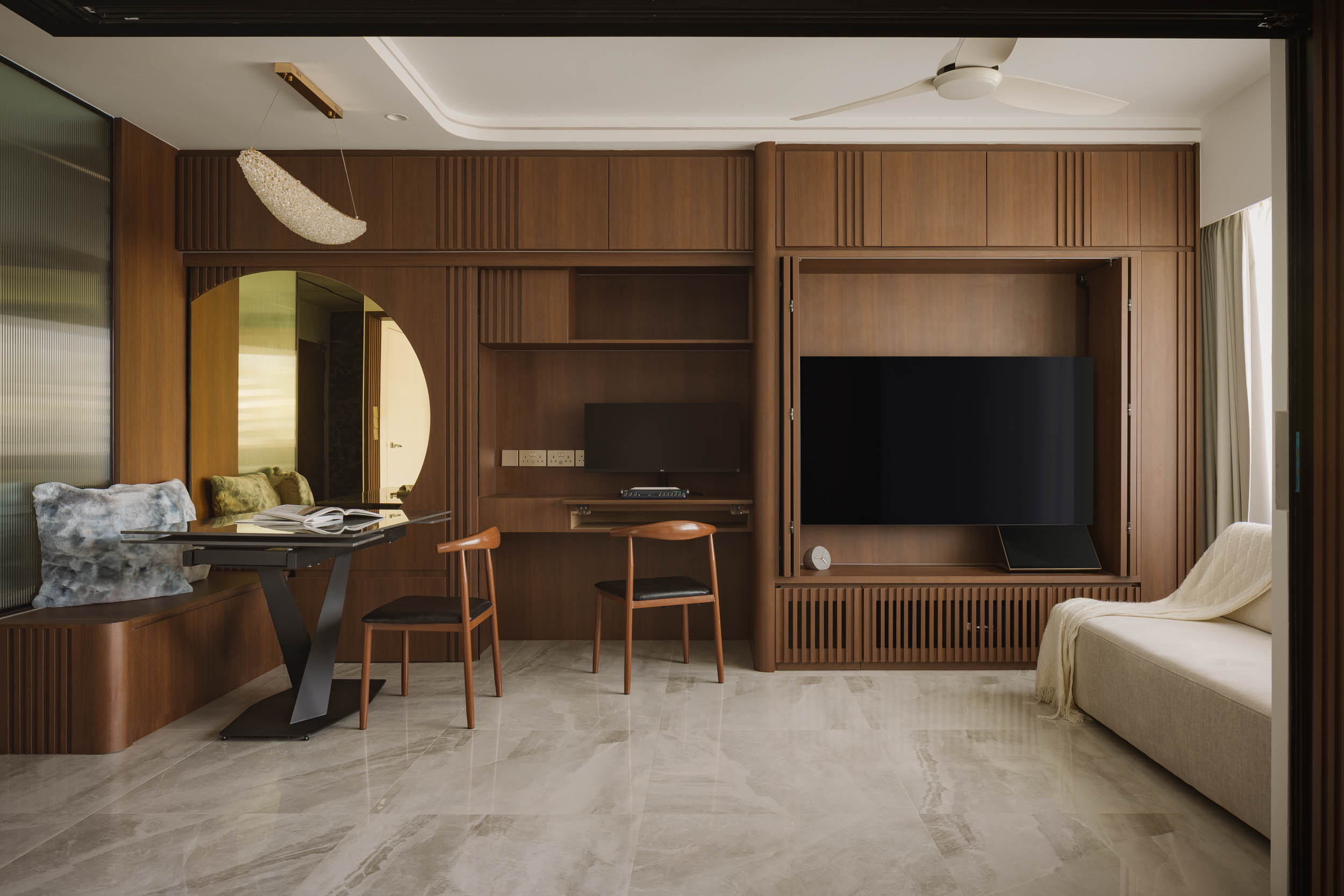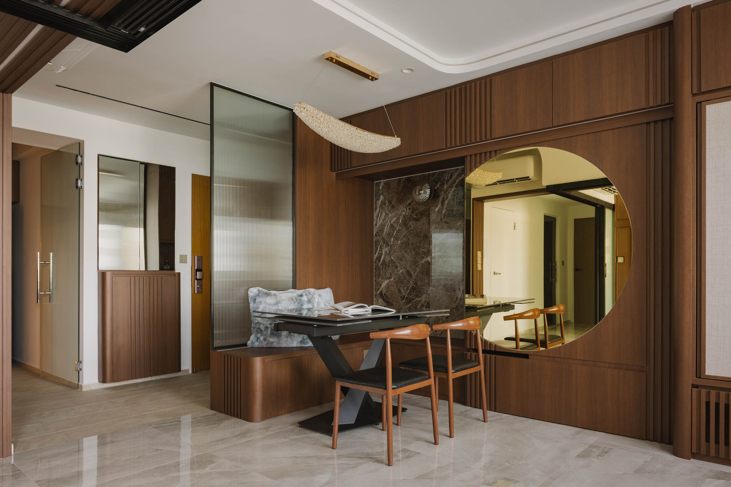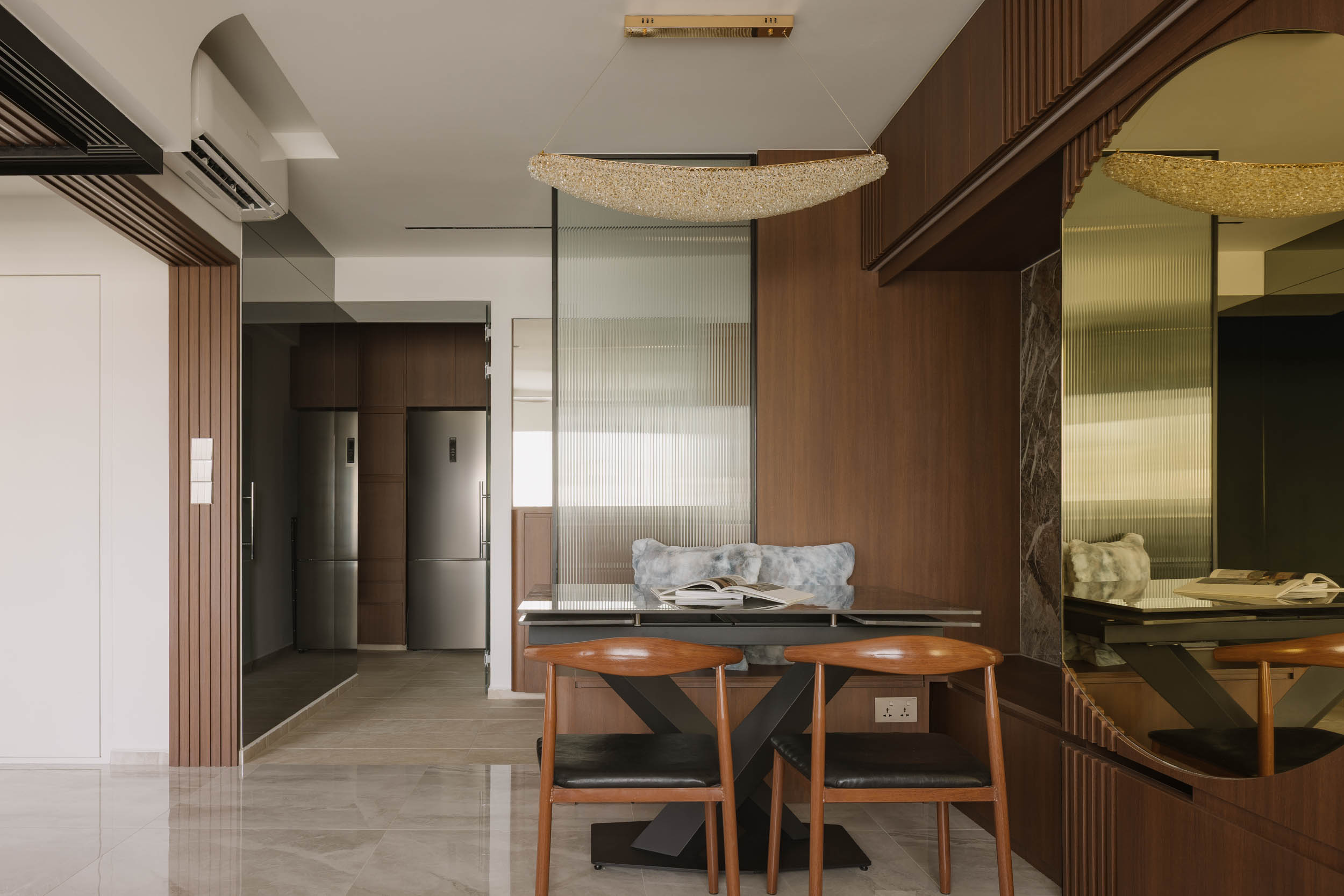 Rooted in sophistication and functionality, this 4-room HDB resale home delivers Modern Luxury through sleek details, warm tones and intentional spatial design. A harmonious palette of wood finishes, marble-grained tiles and accent feature walls sets the tone for a space that feels both elegant and inviting. Bold tinted mirrors are introduced as statement pieces within the communal areas and bathrooms, elevating visual depth while reflecting light to enhance the sense of openness. At the heart of the home lies a thoughtfully planned communal zone where form meets function.