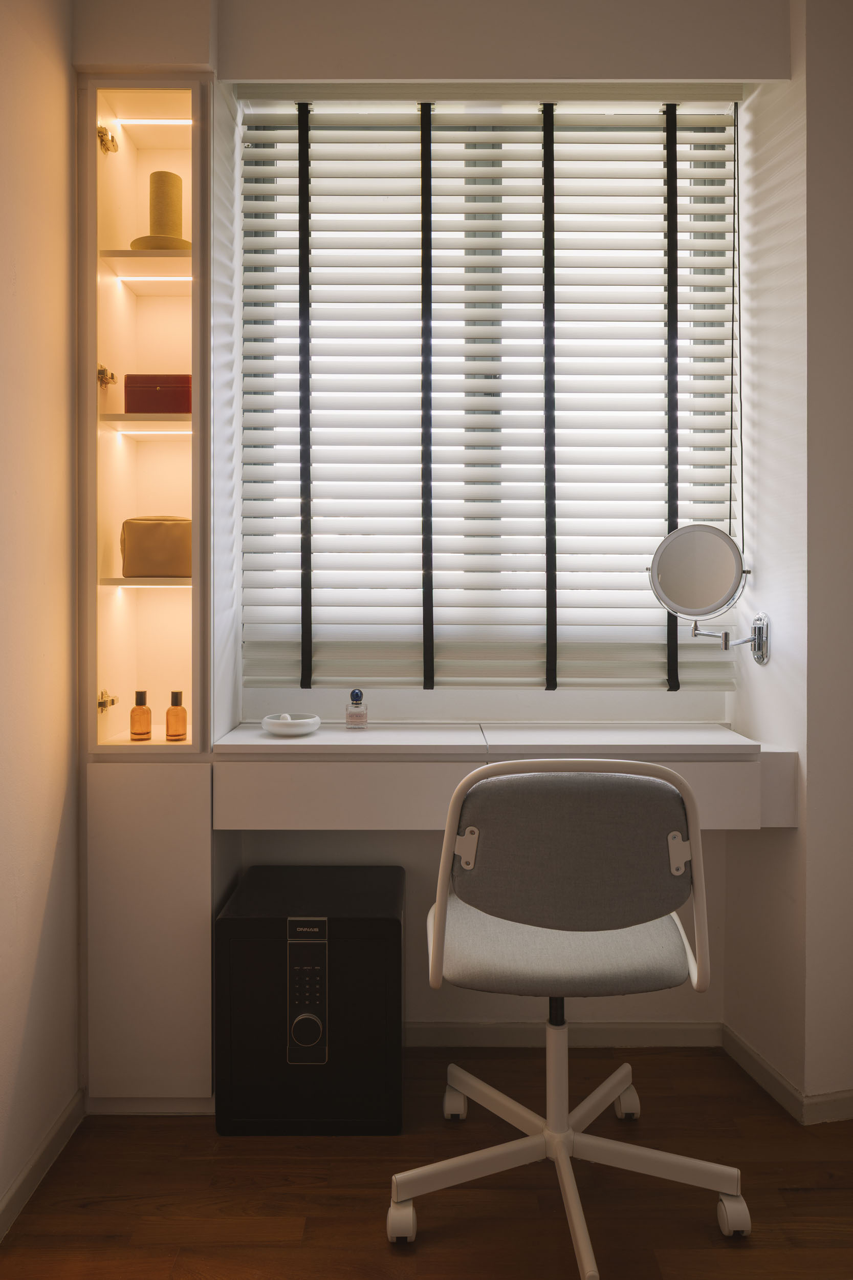 Custom carpentry plays a pivotal role, concealing clutter while accommodating a Murphy bed, two integrated work desks and generous storage solutions. These multifunctional built-ins allow the space to adapt effortlessly to daily living without compromising on aesthetics. A glass sliding door further enhances flexibility, offering privacy when required while maintaining visual continuity and light flow across the home. The ambience stays cosy through the day and settles into tranquil warmth at night. Polished yet comforting — a home designed for refined everyday living.