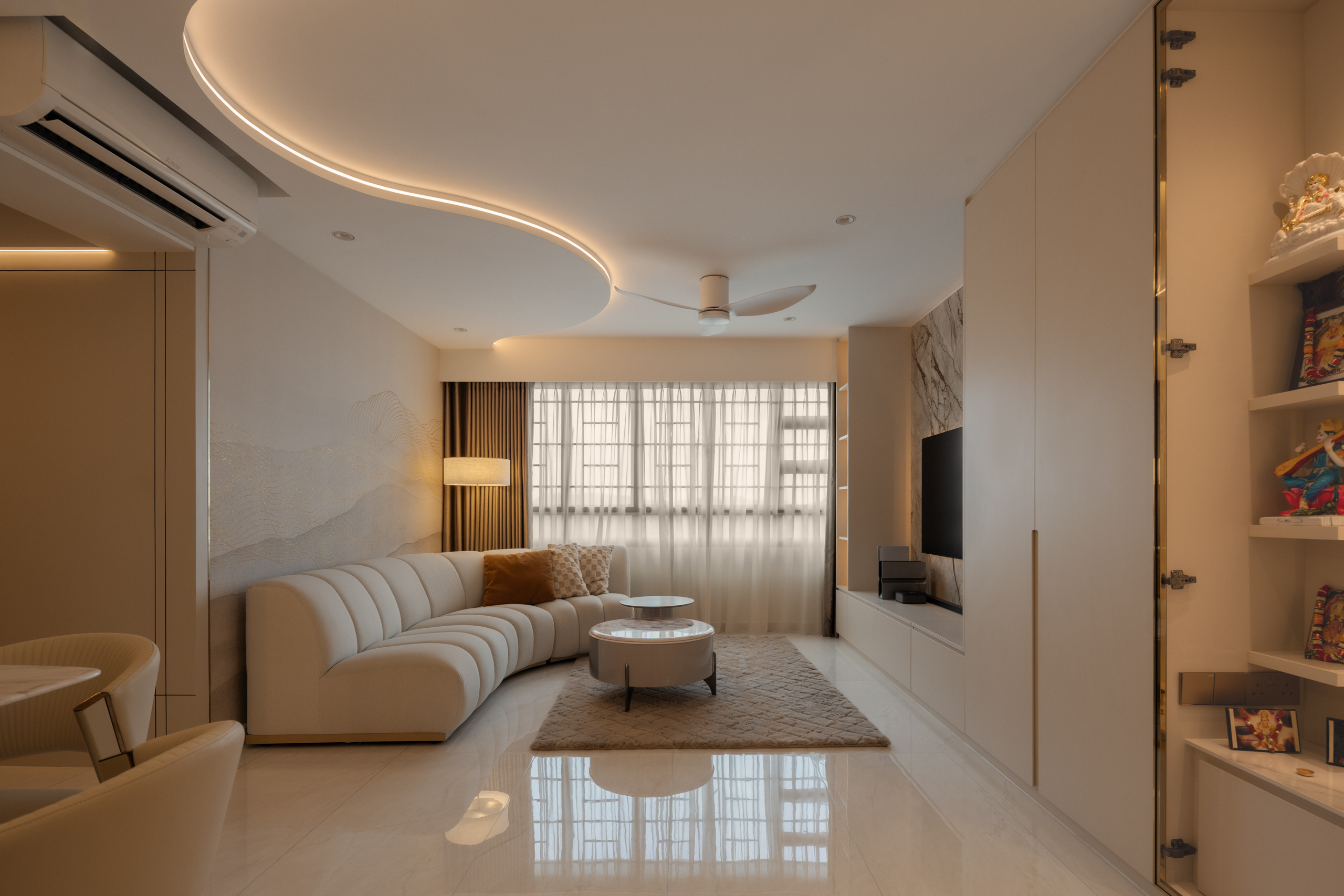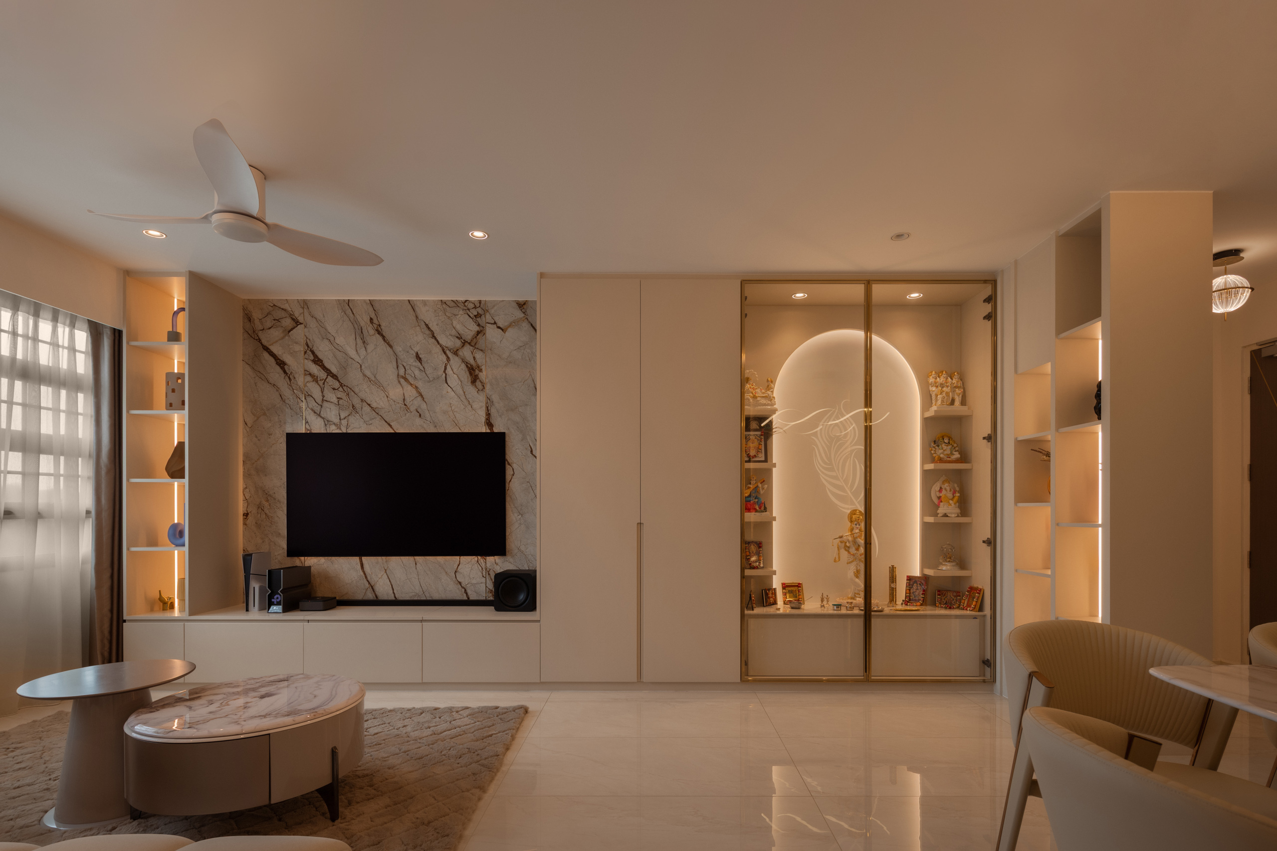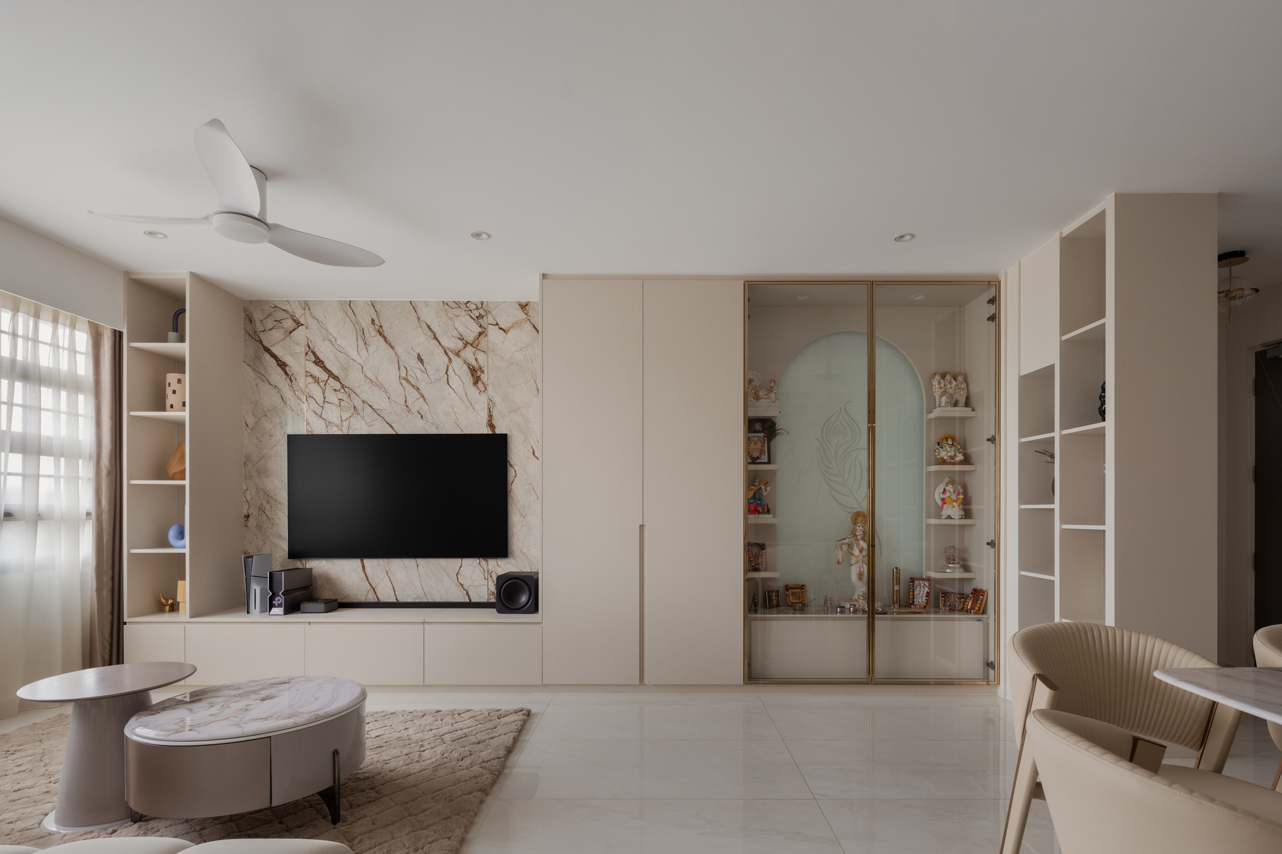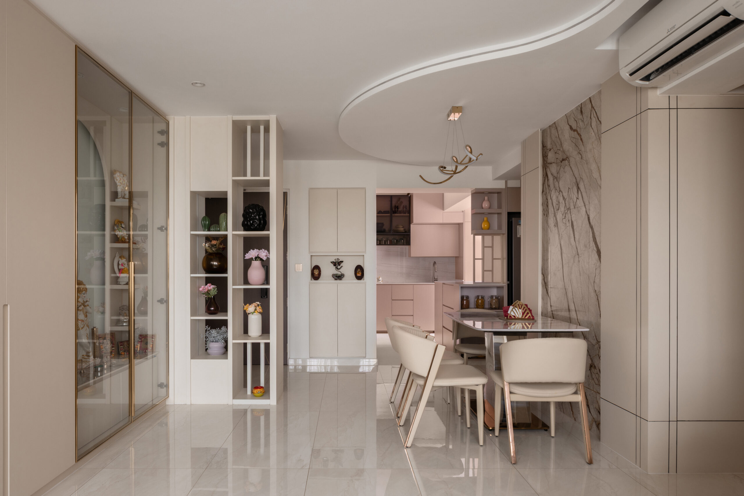 This 5RM resale HDB was designed around the rhythms of a family of three, with space for a helper and visiting grandparents. Guided by Vastu Shastra, the home places quiet importance on the mandir, weaving it into daily life rather than setting it apart. Just beyond the entrance, a divider creates privacy, allowing moments of prayer to feel more personal.