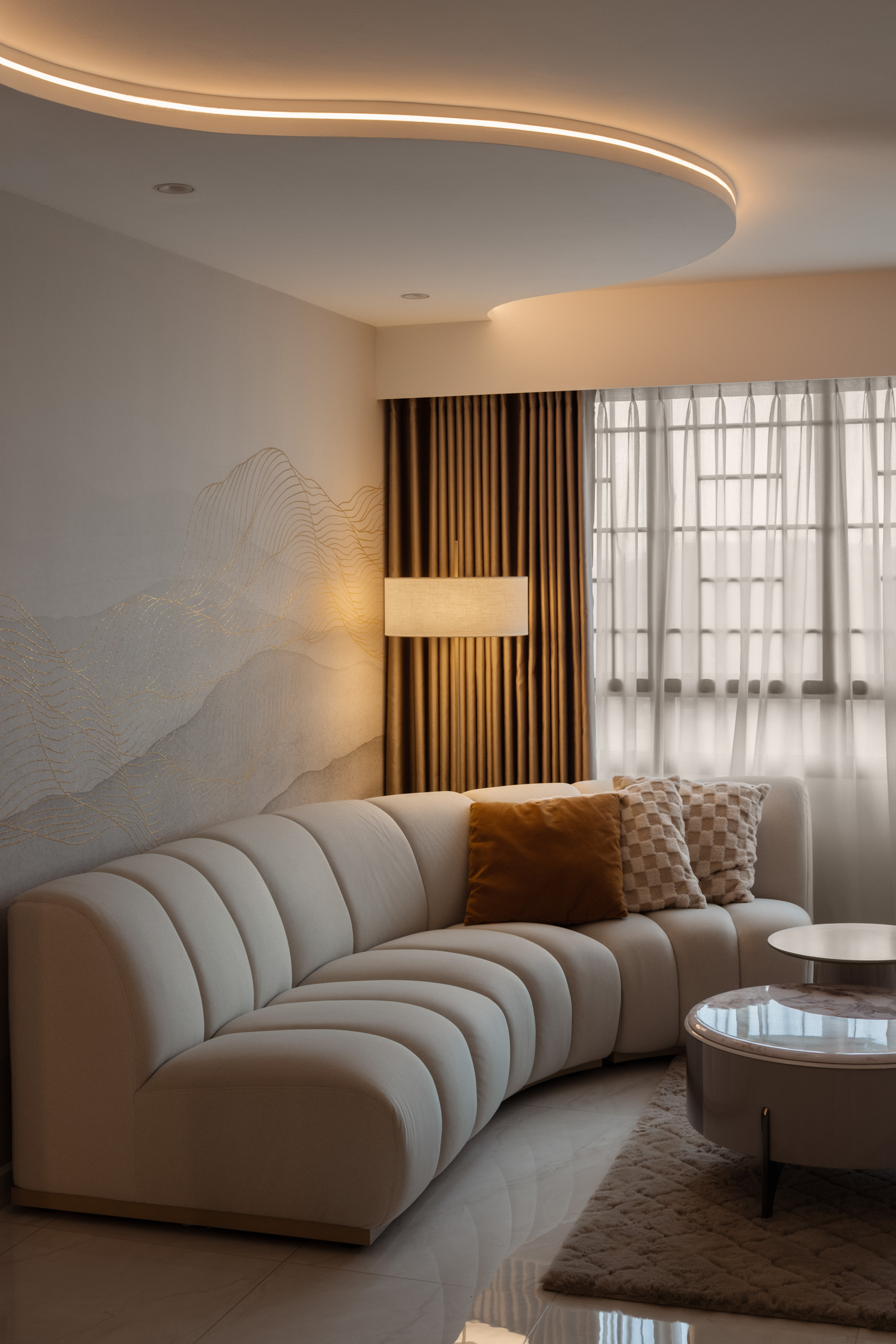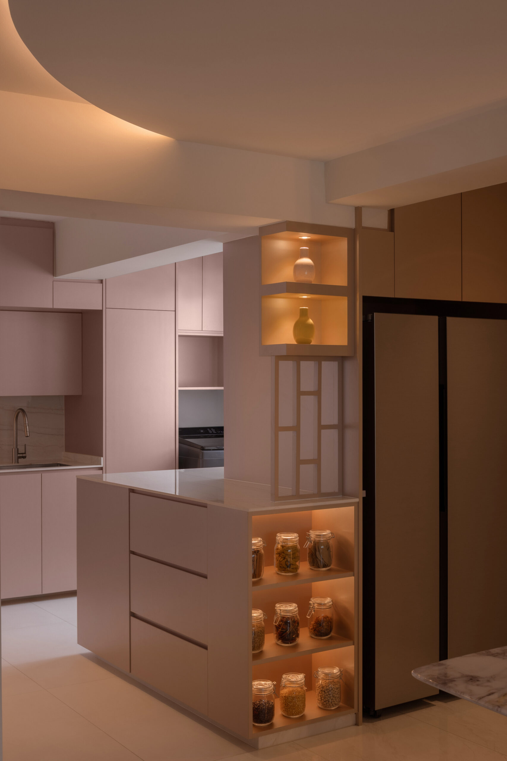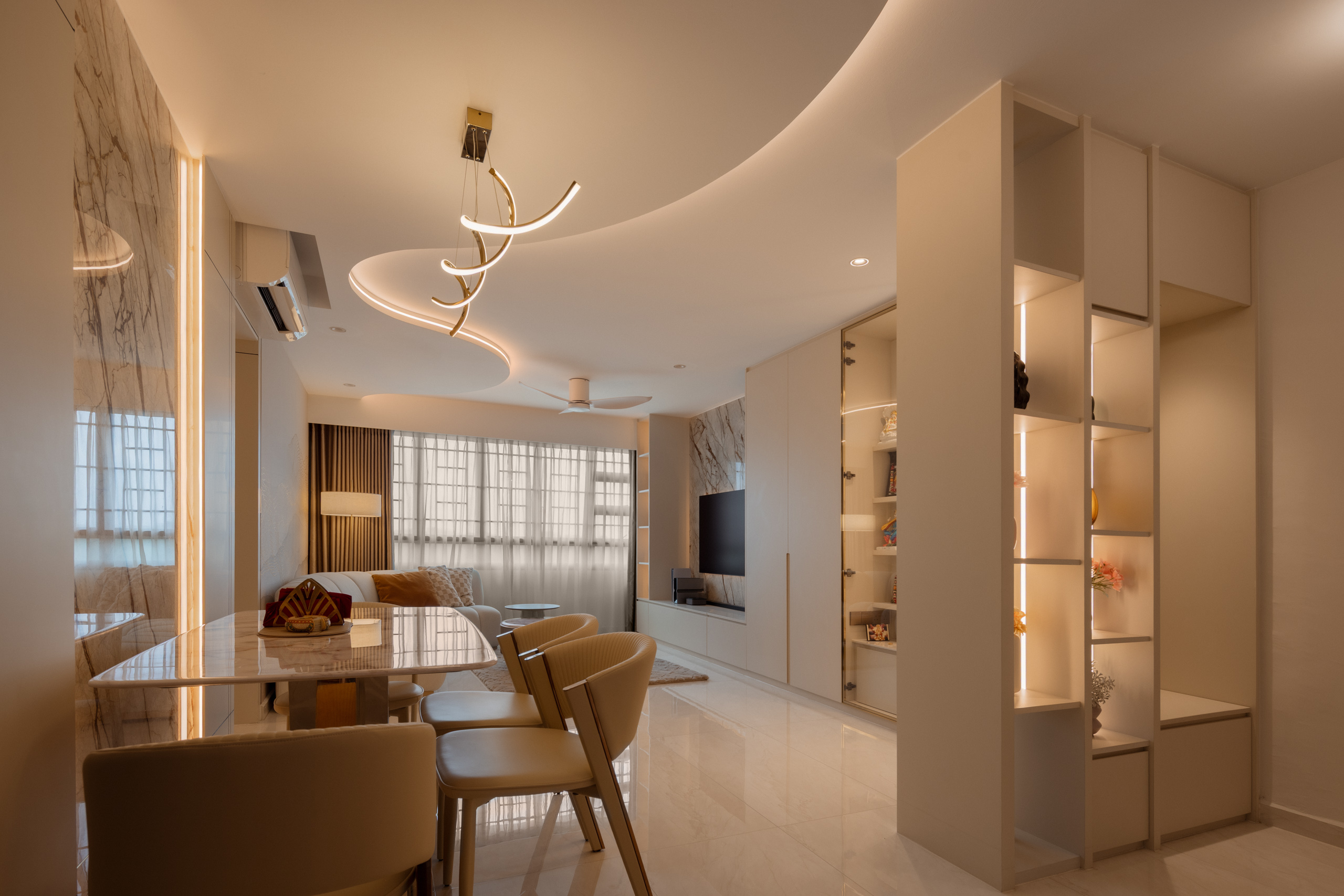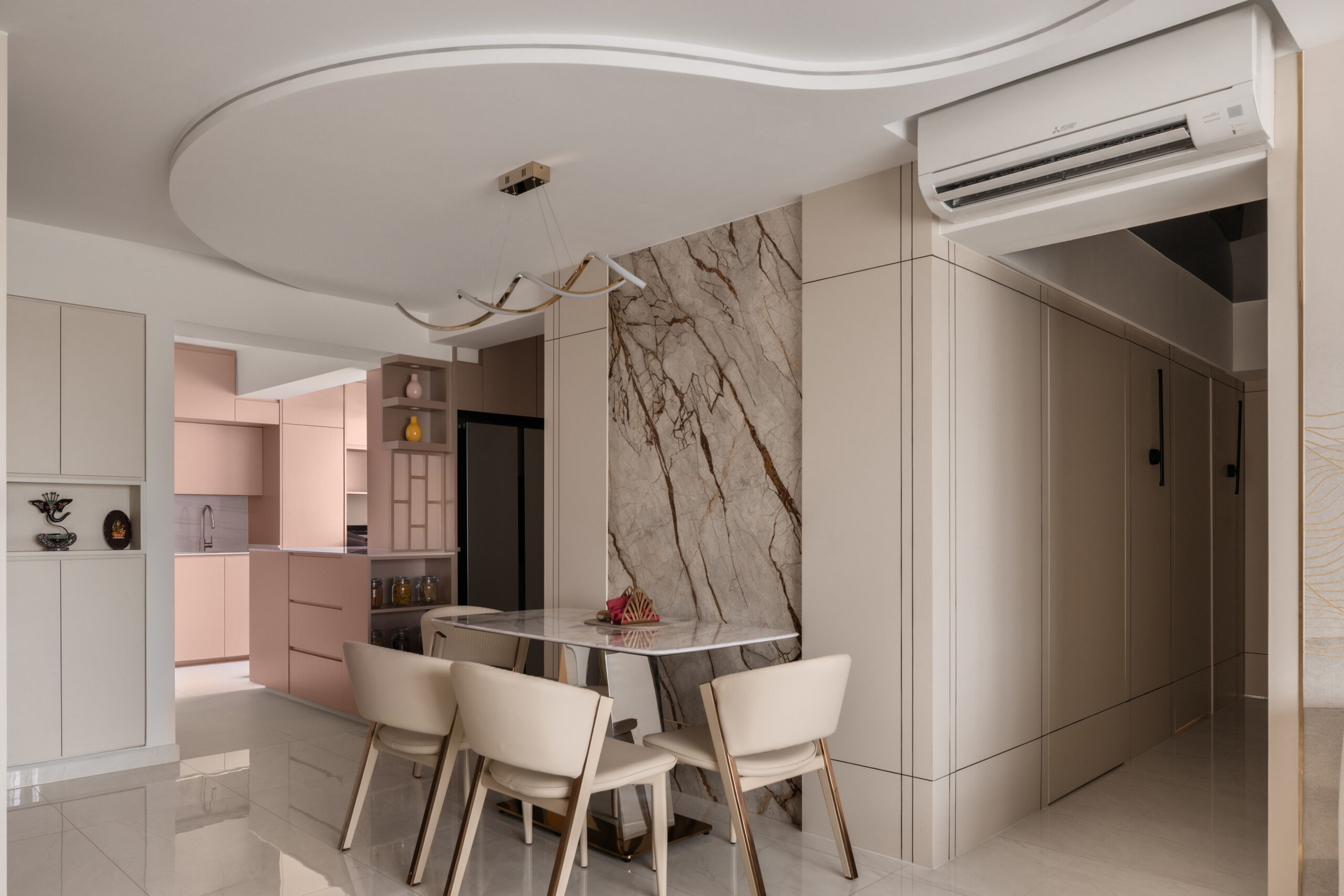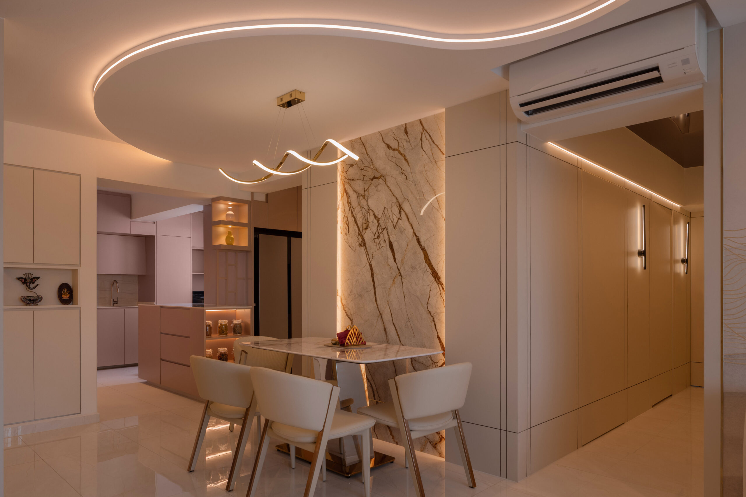 Across the home, the palette stays calm but layered. Marble-look surfaces, soft gold accents, and lightly textured finishes introduce a subtle sense of modern luxury, while curved details soften the space. A three-tone lighting system allows the mood to shift throughout the day.