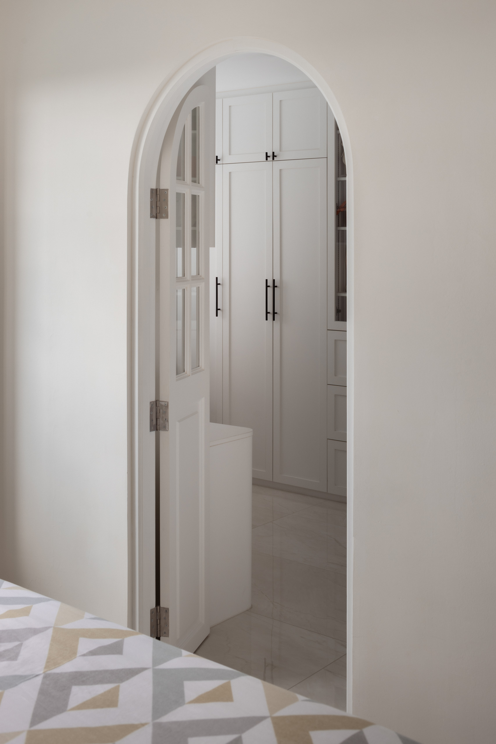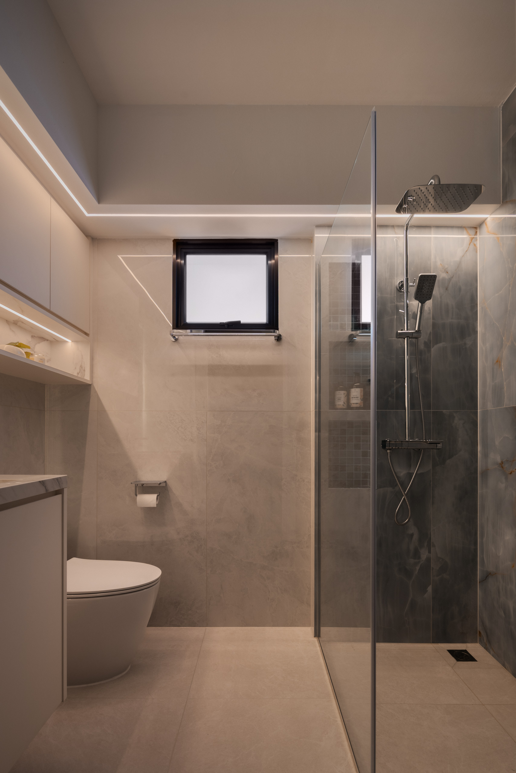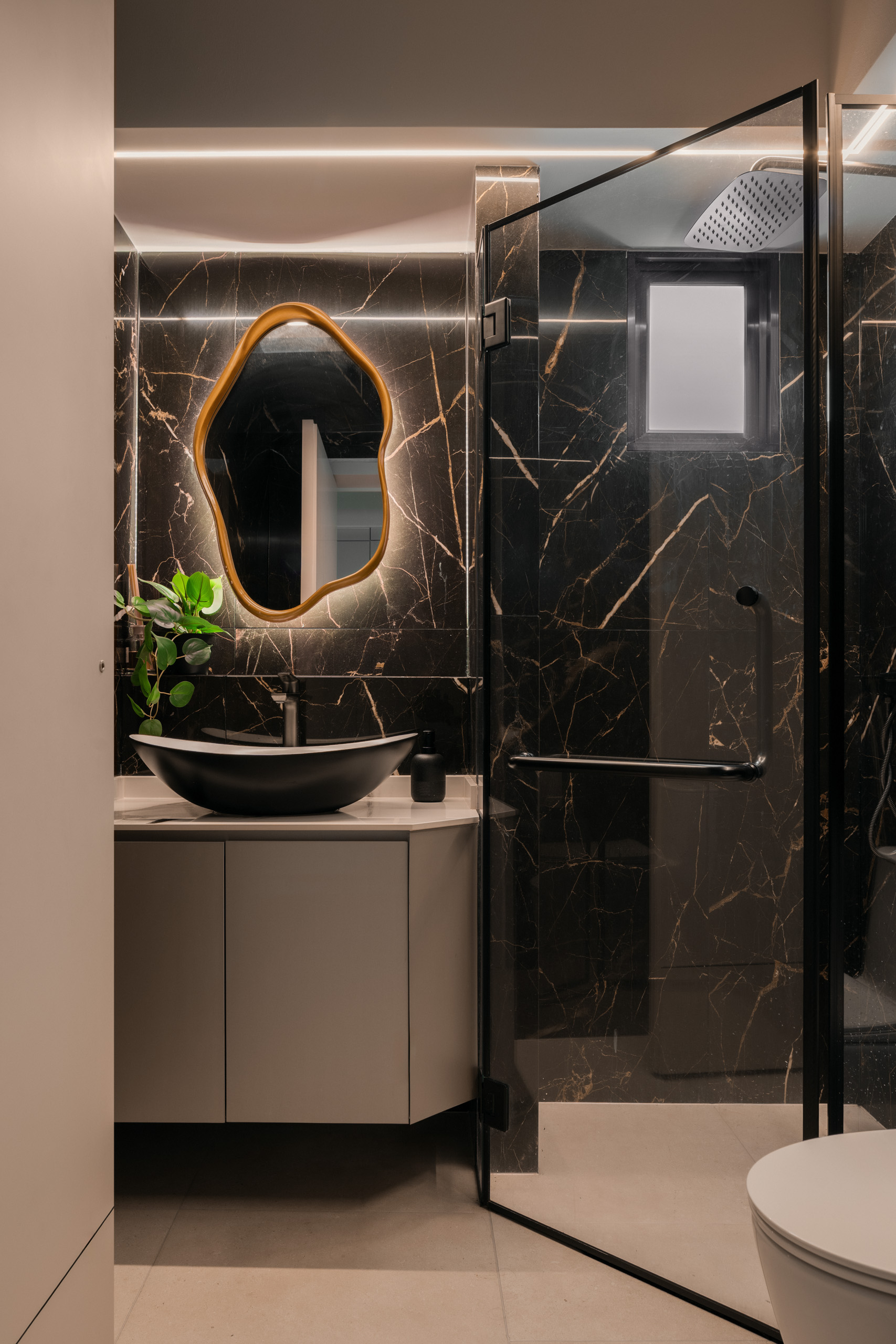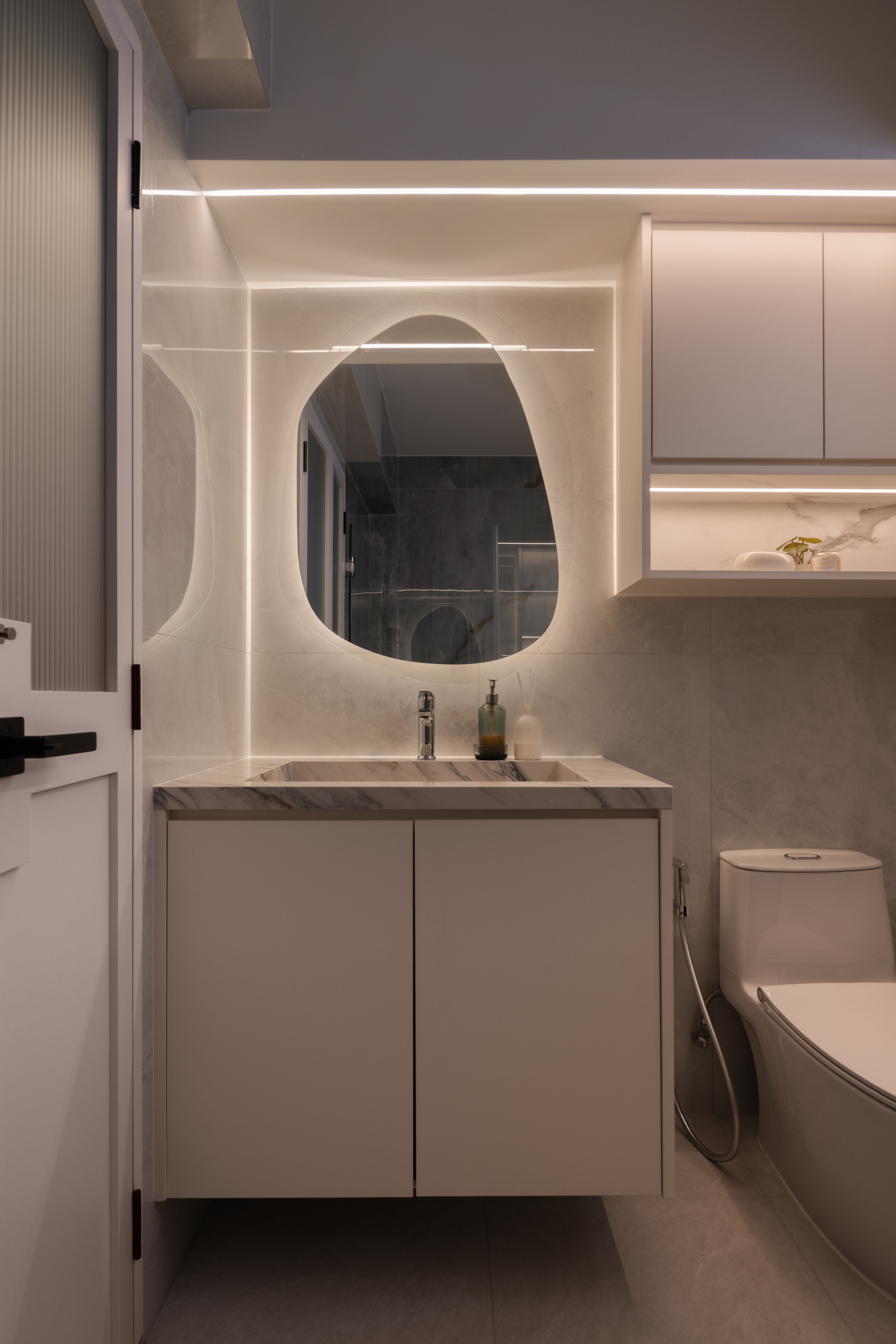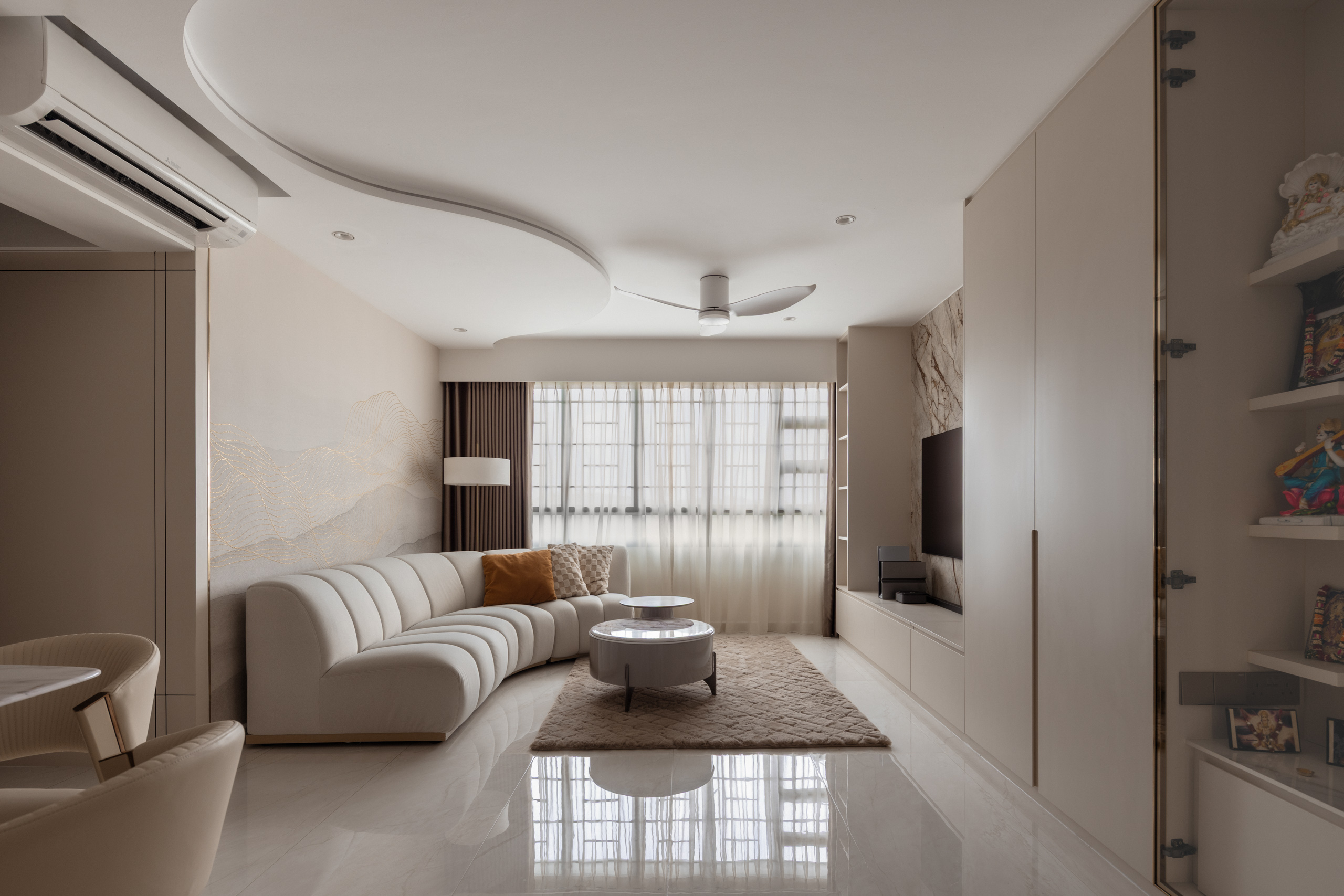 Across the home, the palette stays calm but layered. Marble-look surfaces, soft gold accents, and lightly textured finishes introduce a subtle sense of modern luxury, while curved details soften the space. A three-tone lighting system allows the mood to shift throughout the day.