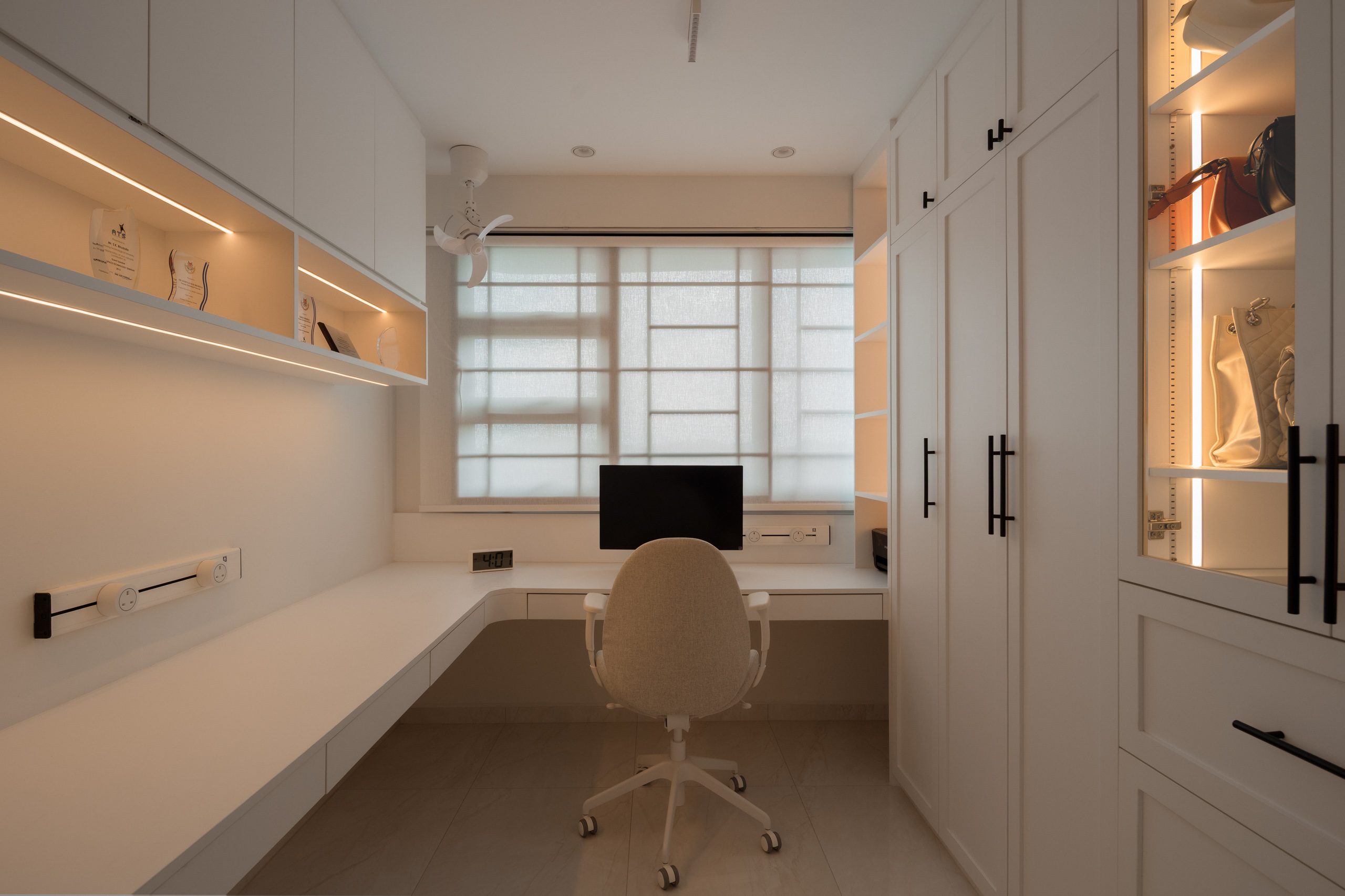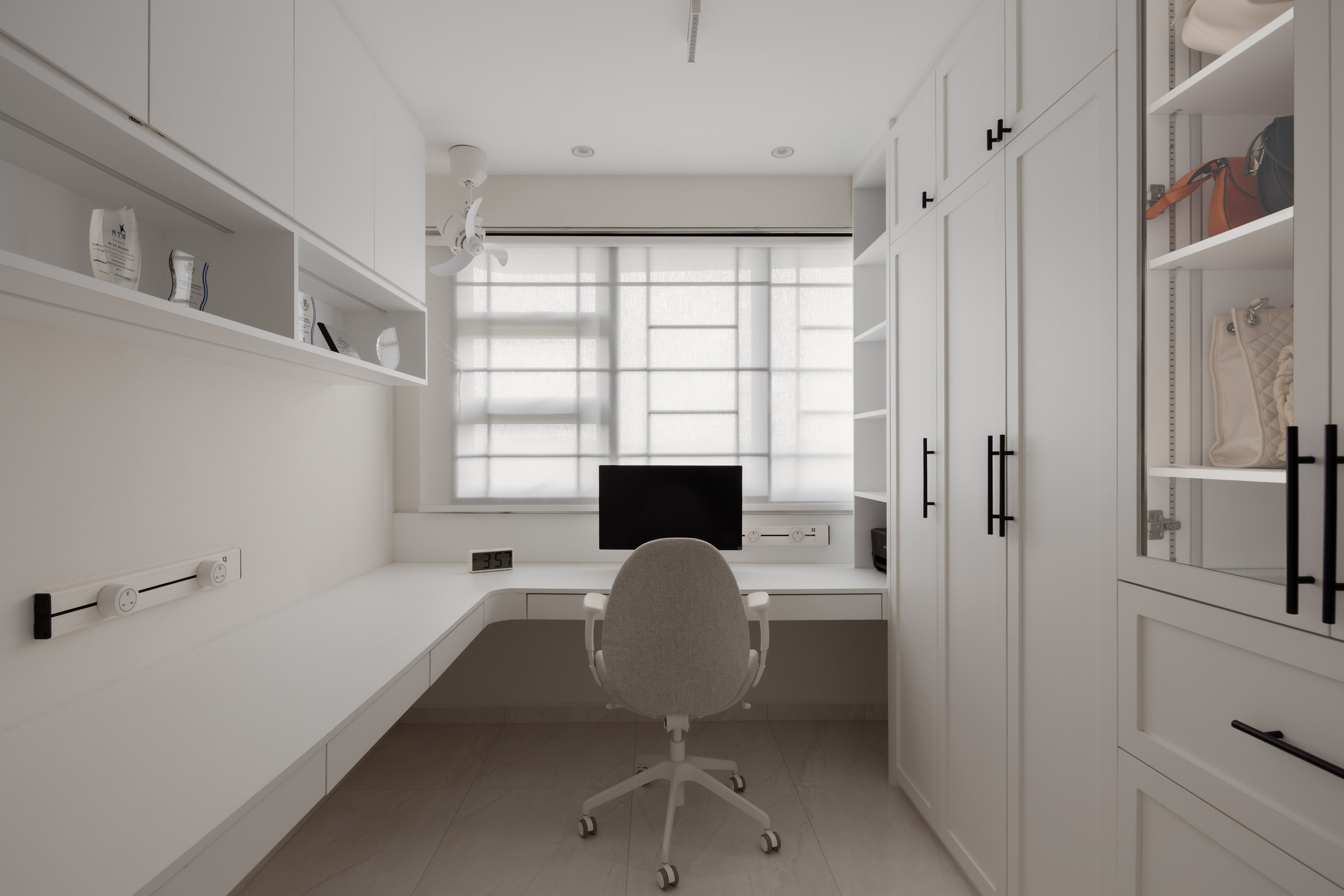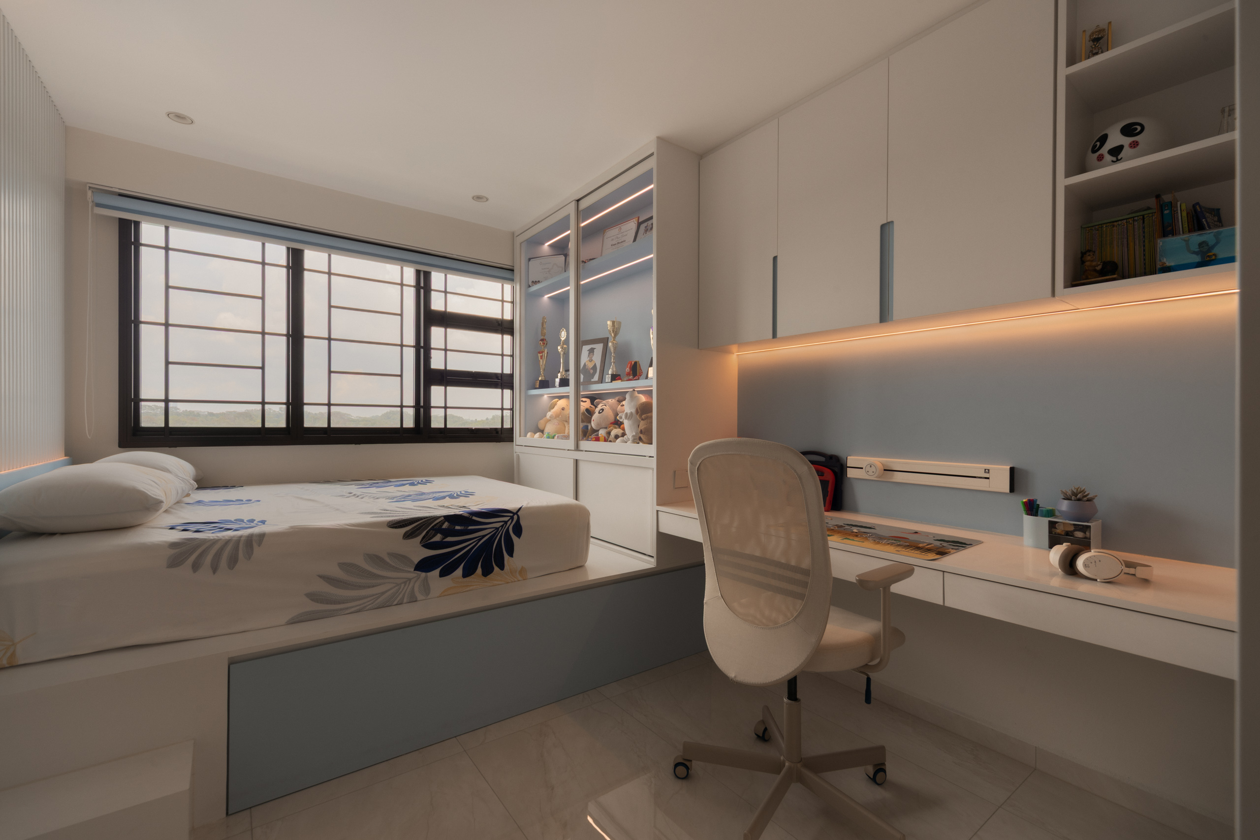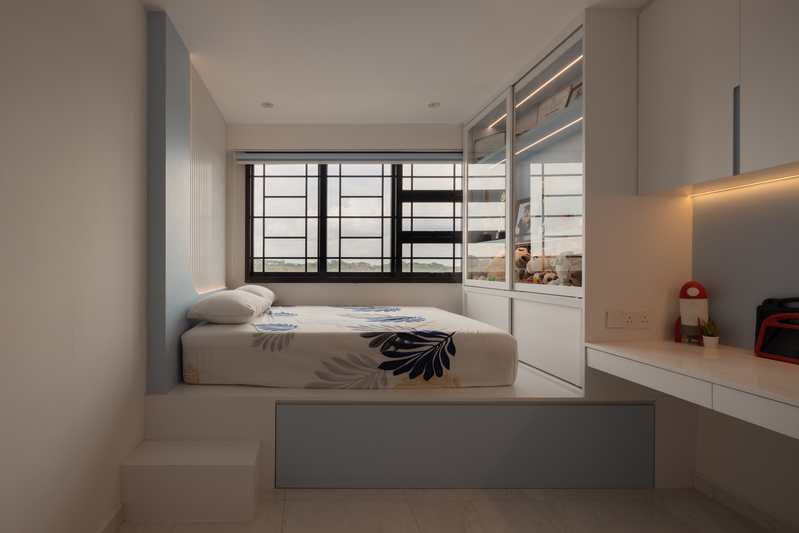 Further in, spaces are shaped around flexibility. The master bedroom carries softer tones, while an adjacent room becomes a walk-in wardrobe and study. In the son’s room, a pull-out bed makes space for visiting grandparents, allowing the home to adapt over time.