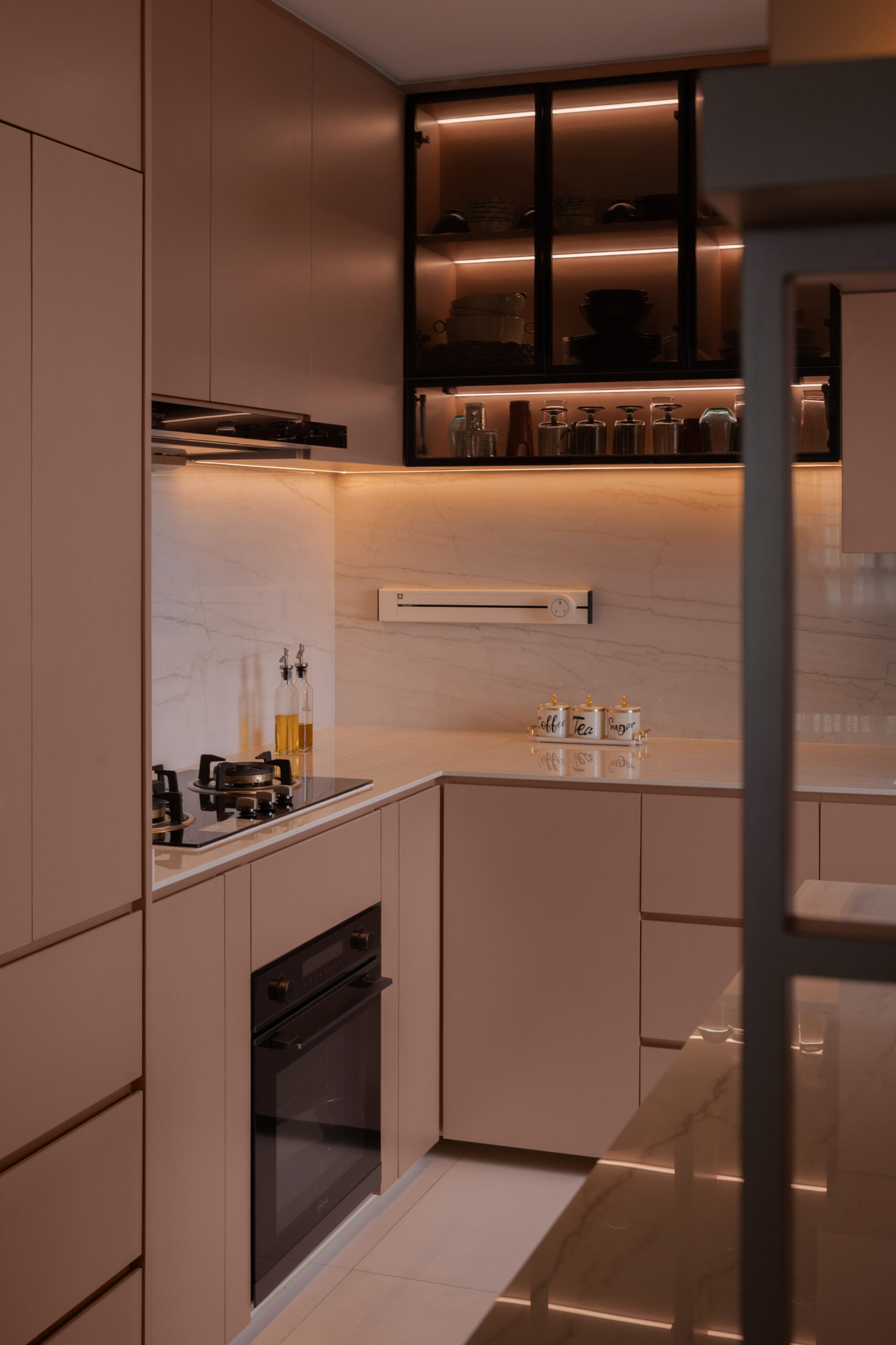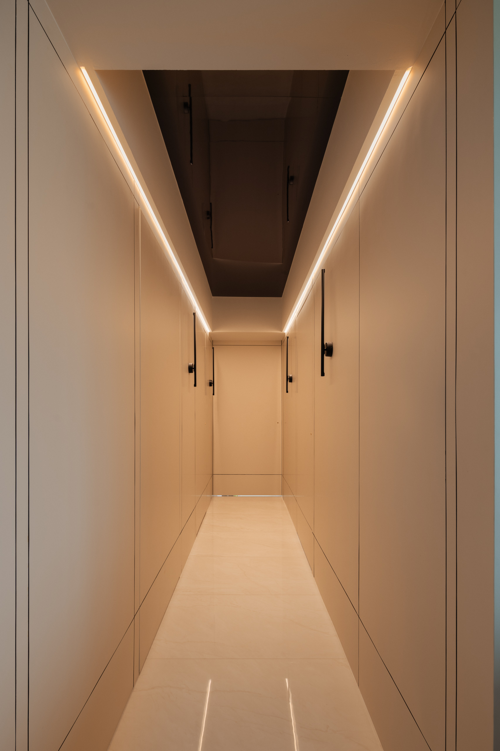 We also approached the transition to the private areas more intentionally. Through lighting, material choices, and concealed doors, the walkway feels clean and considered.