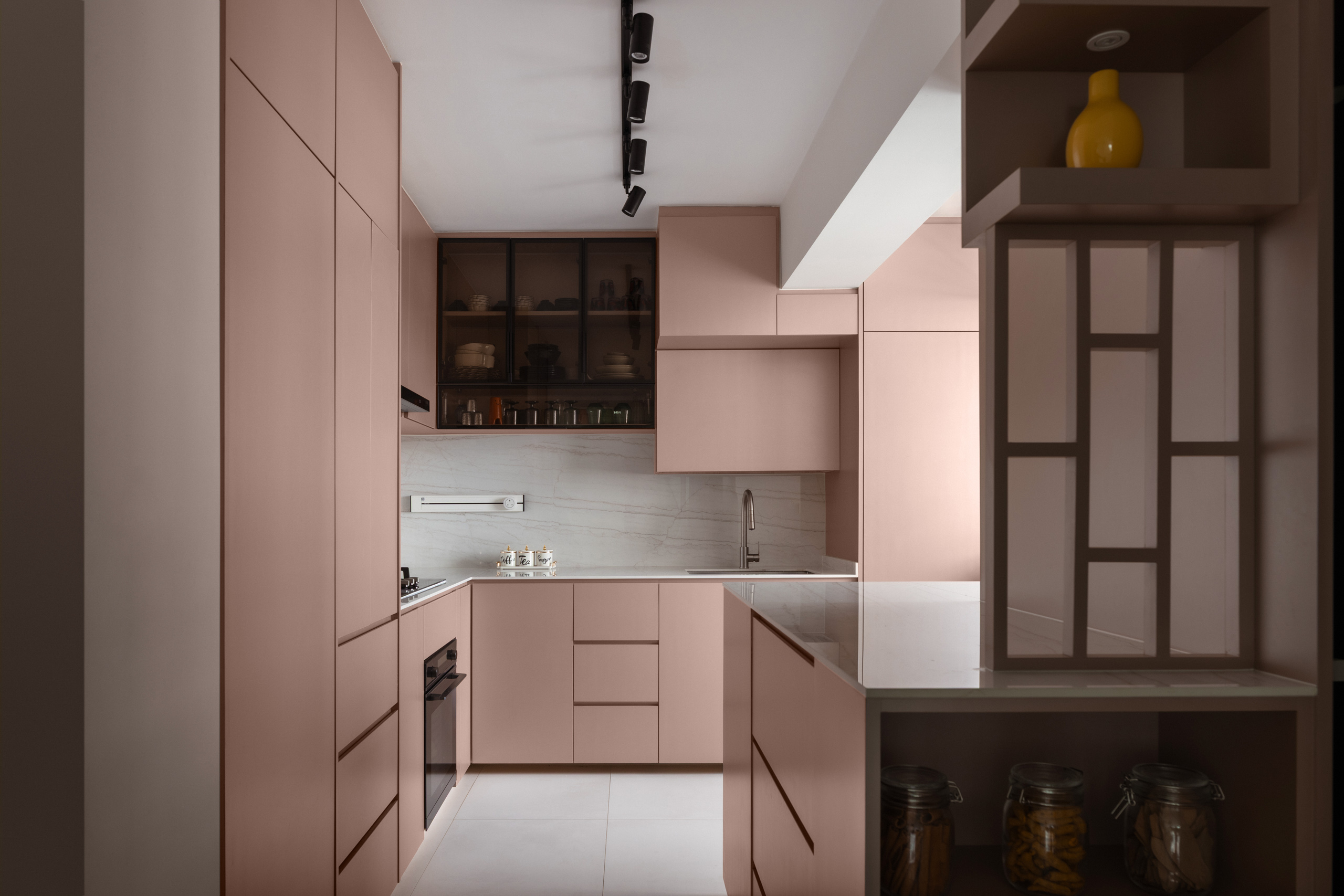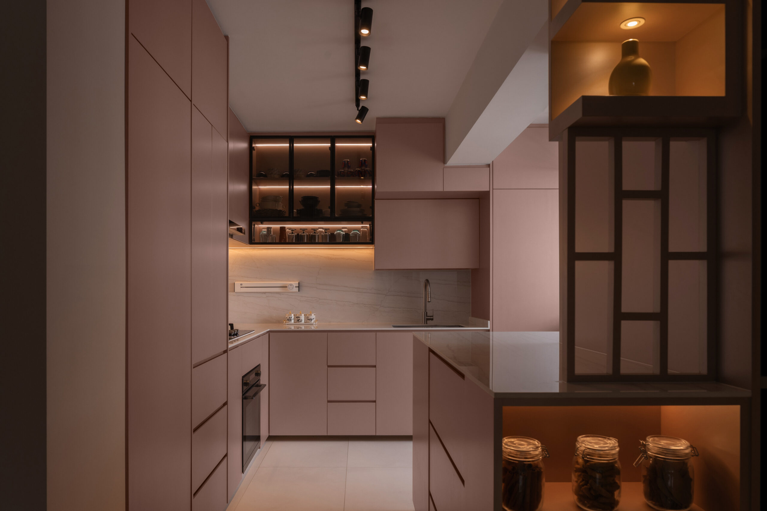 The kitchen reflects how the family lives. Designed for heavy cooking, it prioritises accessibility through integrated storage and concealed elements that keep surfaces clear. A satin pink finish introduces gentle contrast while sitting comfortably within the overall palette.