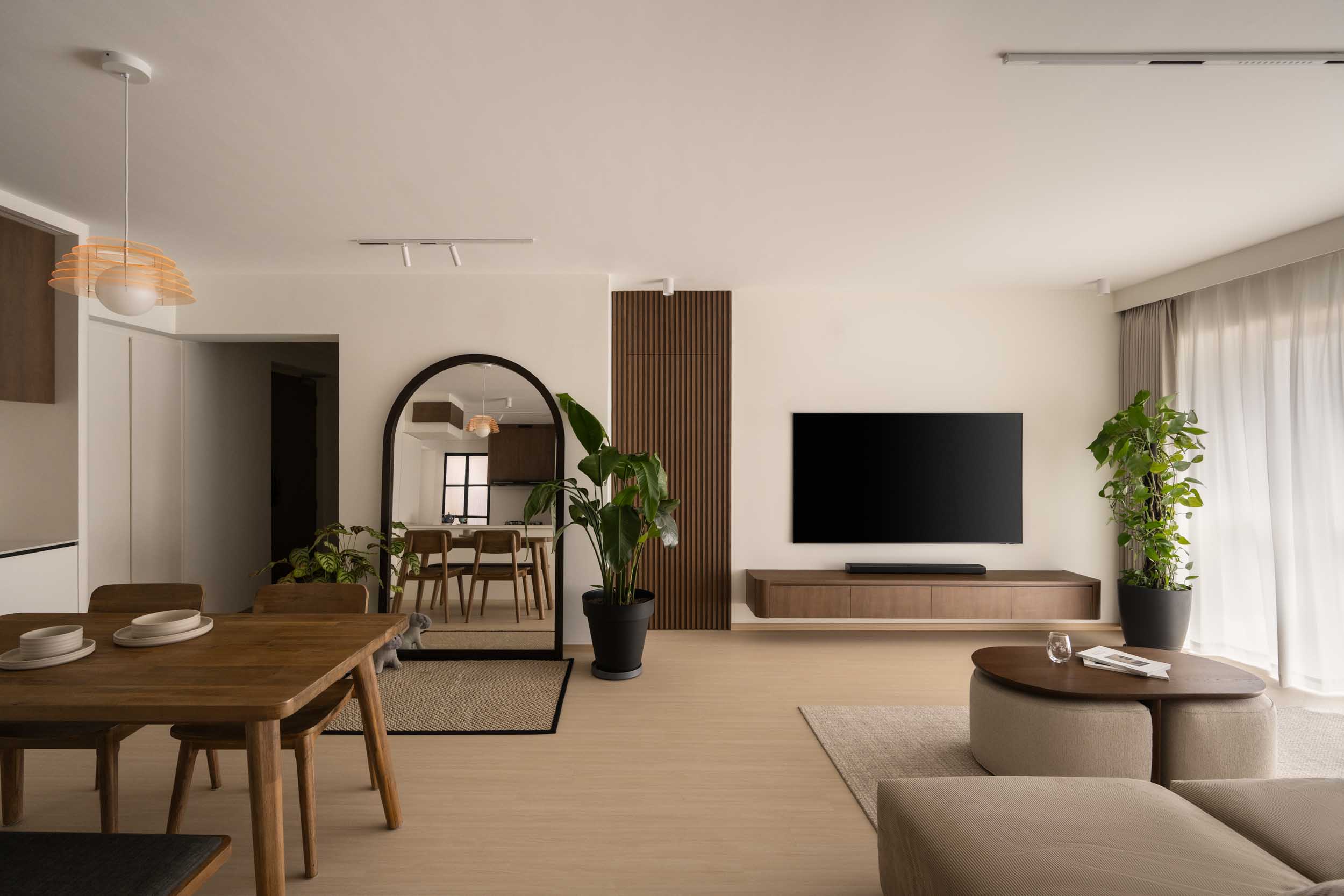 Modern open-plan living and dining area showcasing HDB interior design Singapore with warm wood finishes, indoor plants, and a bright, airy layout.